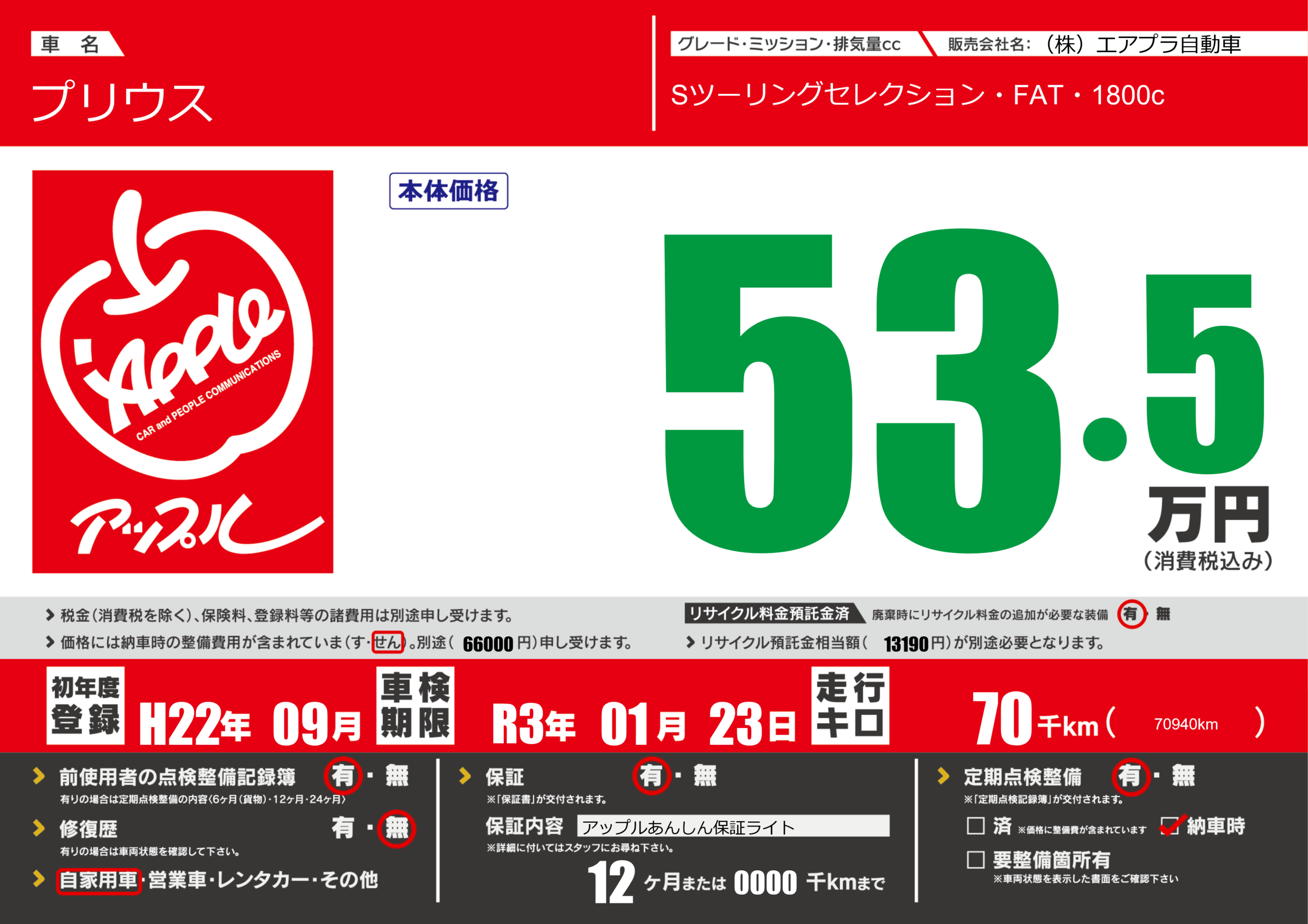 | 車名 | プリウス | グレード ミッション 排気量 |
