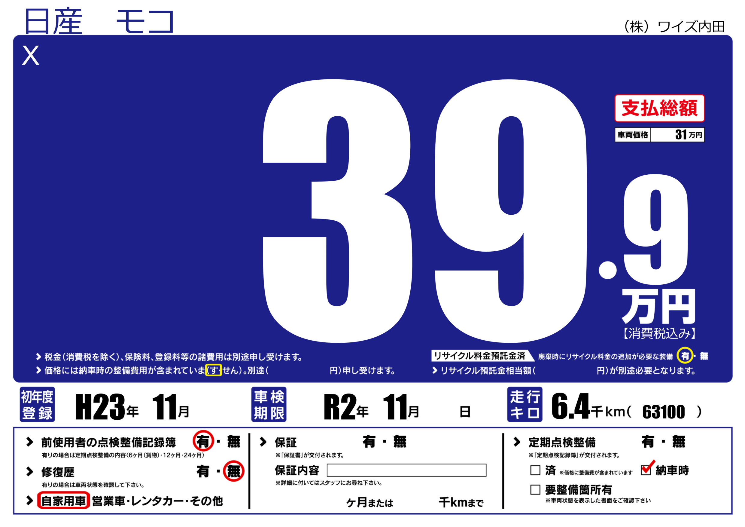 | 車名 | 日産 モコ | グレード ミッション 排気量 |
