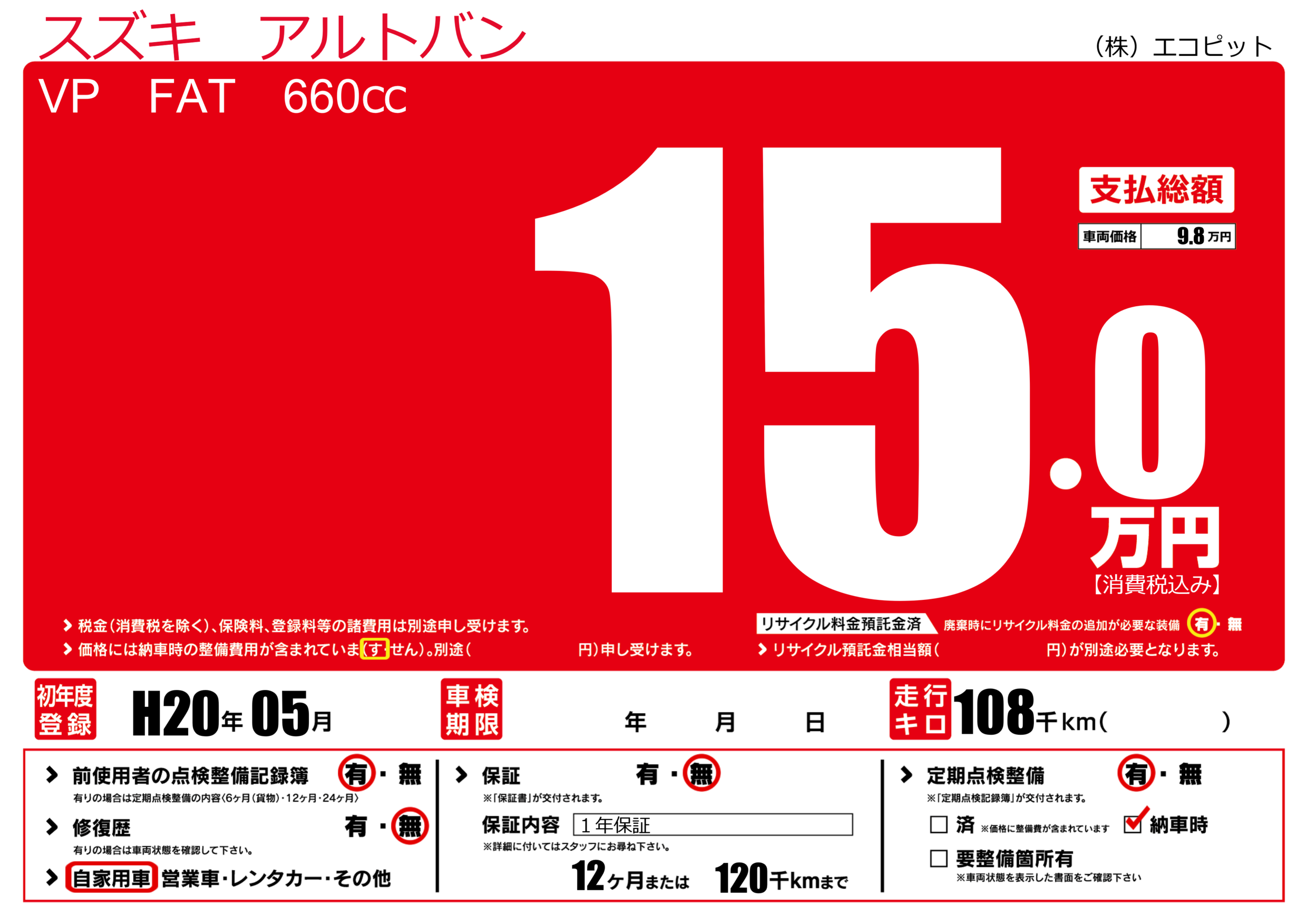 | 走行キロ | 10.8万km | 初年度登録 | H20年05月 |
