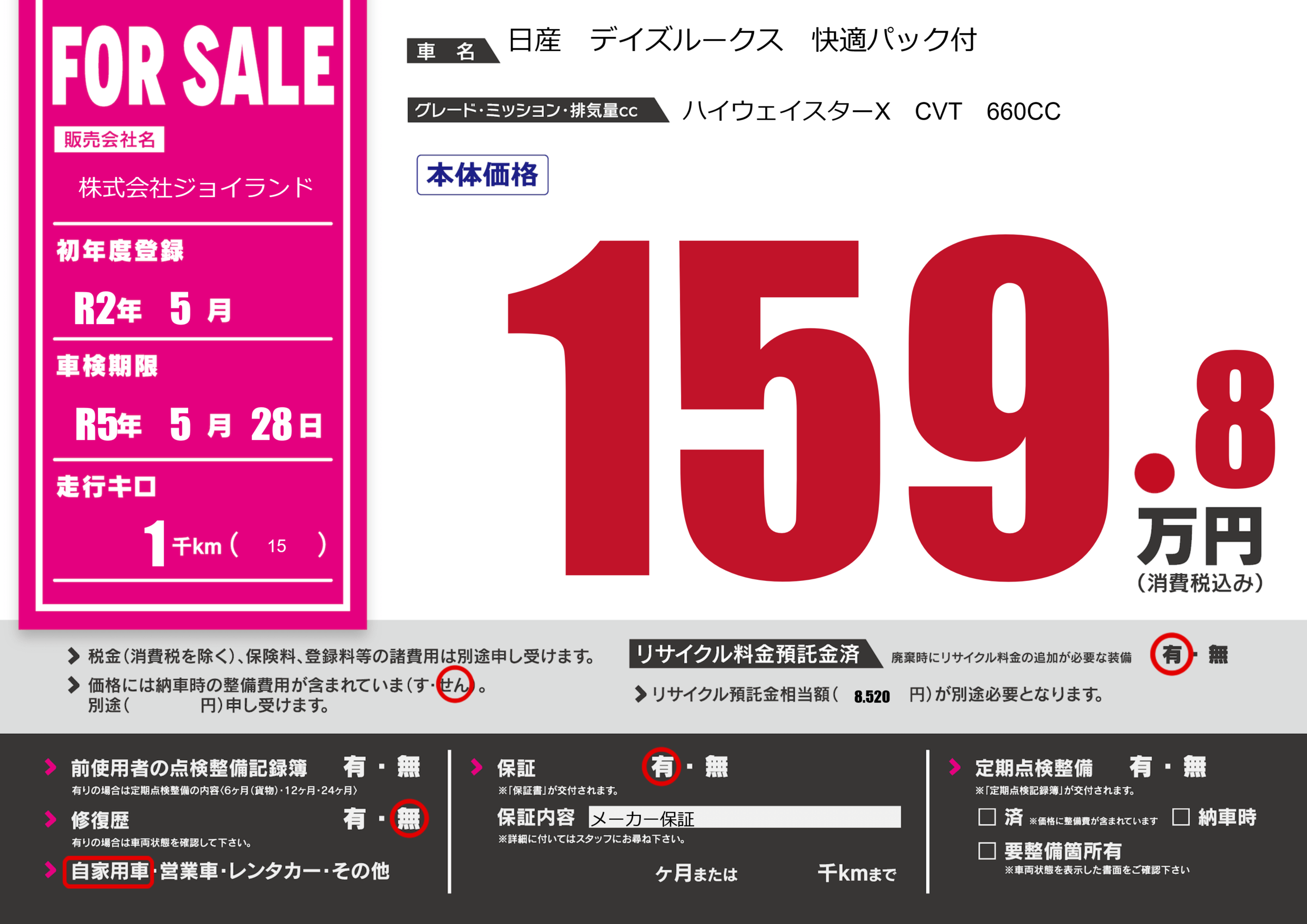 | 車名 | 日産 デイズルークス 快適パック付 | グレード ミッション 排気量 |