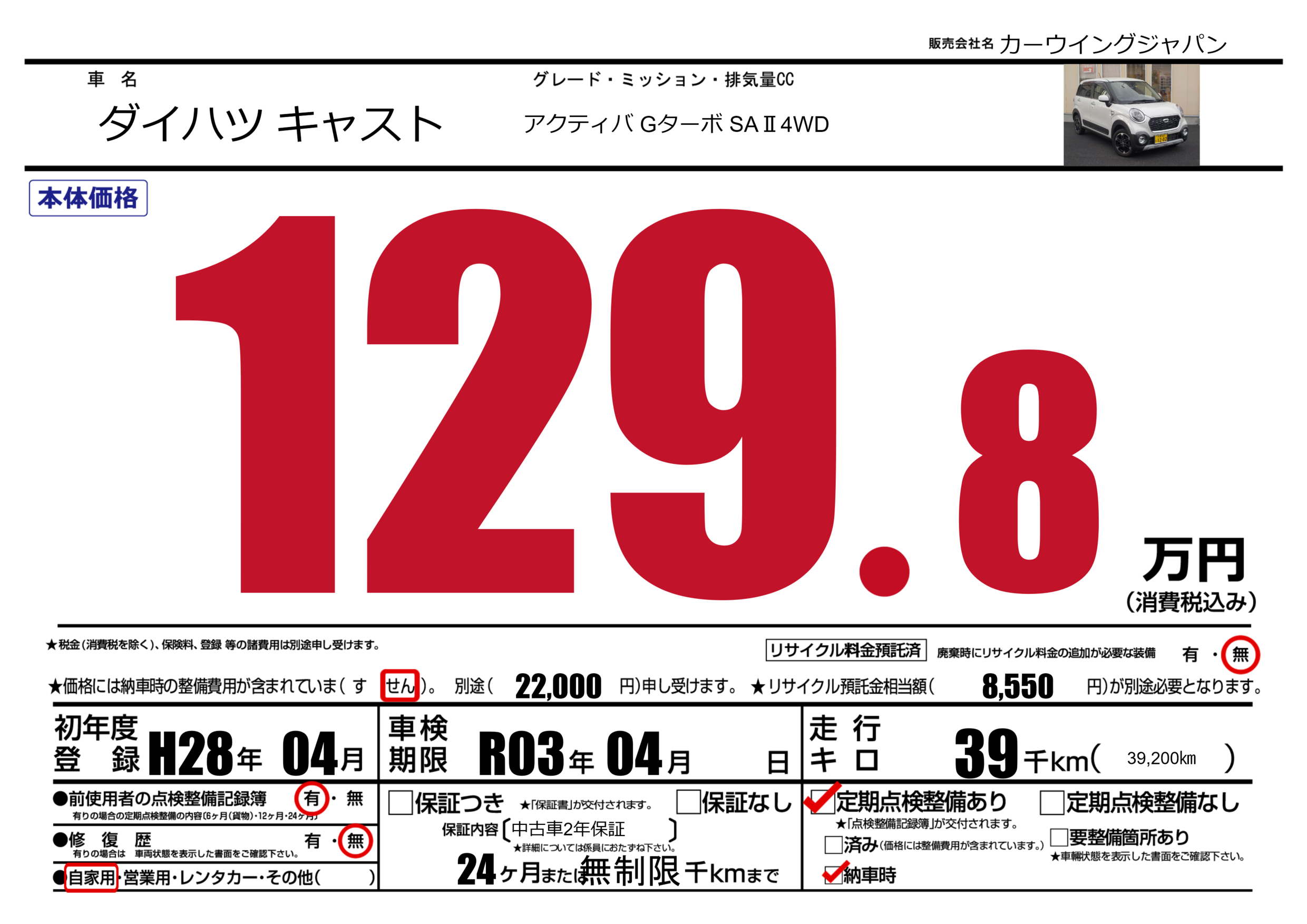 保証なし 保証内容(中古車2年保証) 24ヶ月または(無制限)千kmまで |