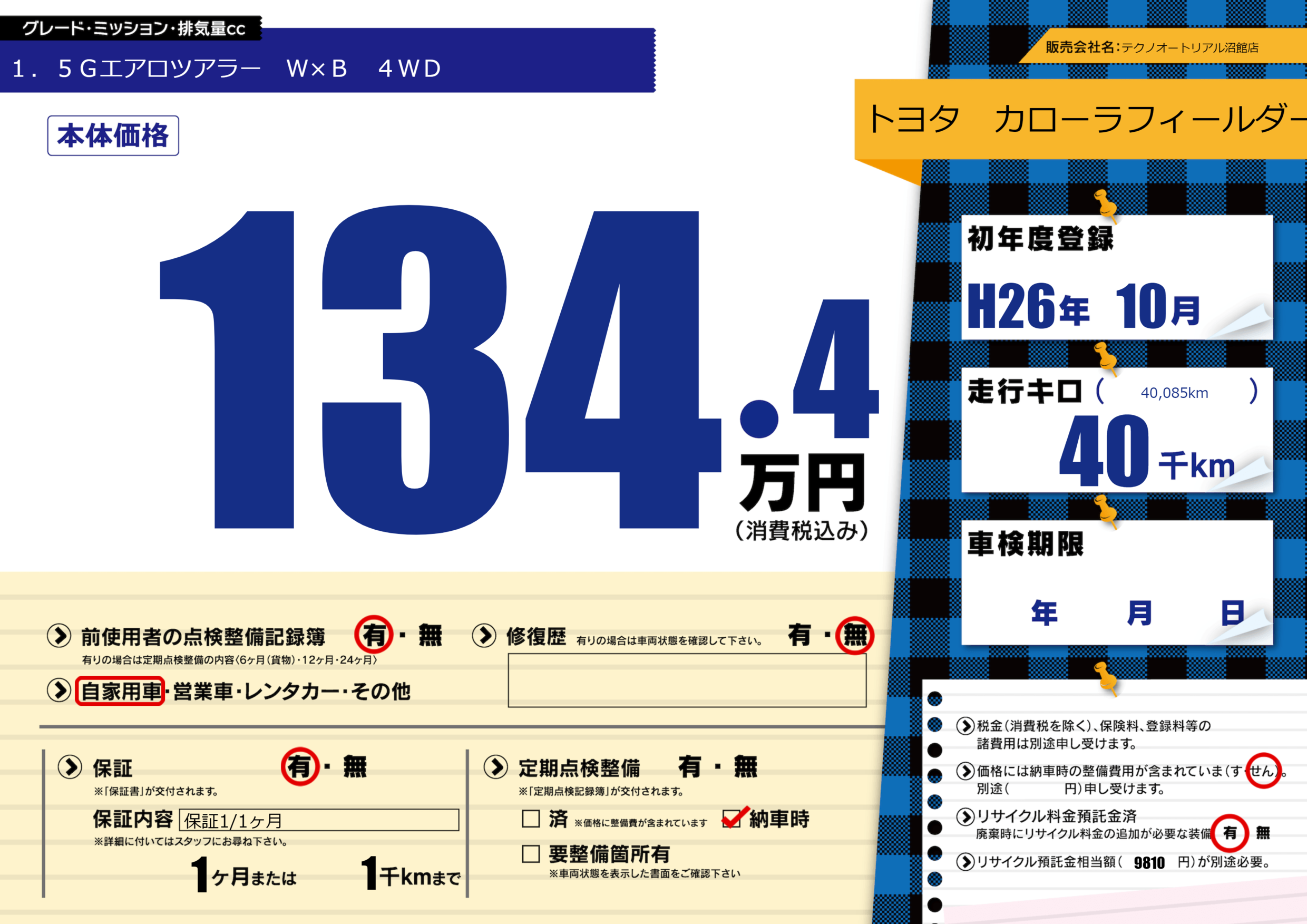 | 車名 | トヨタ カローラフィールダー | グレード ミッション 排気量 |