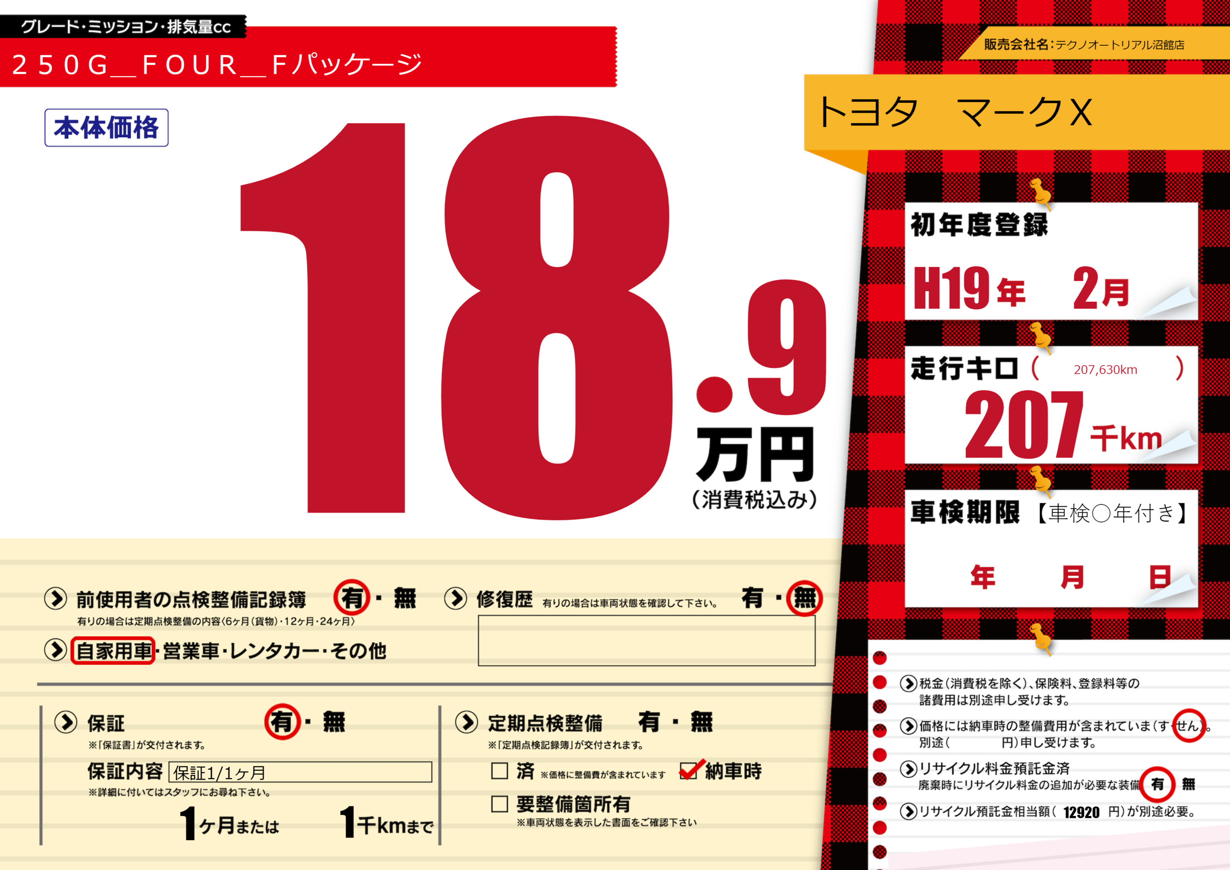 | 車名 | トヨタ マークX | グレード ミッション 排気量 |