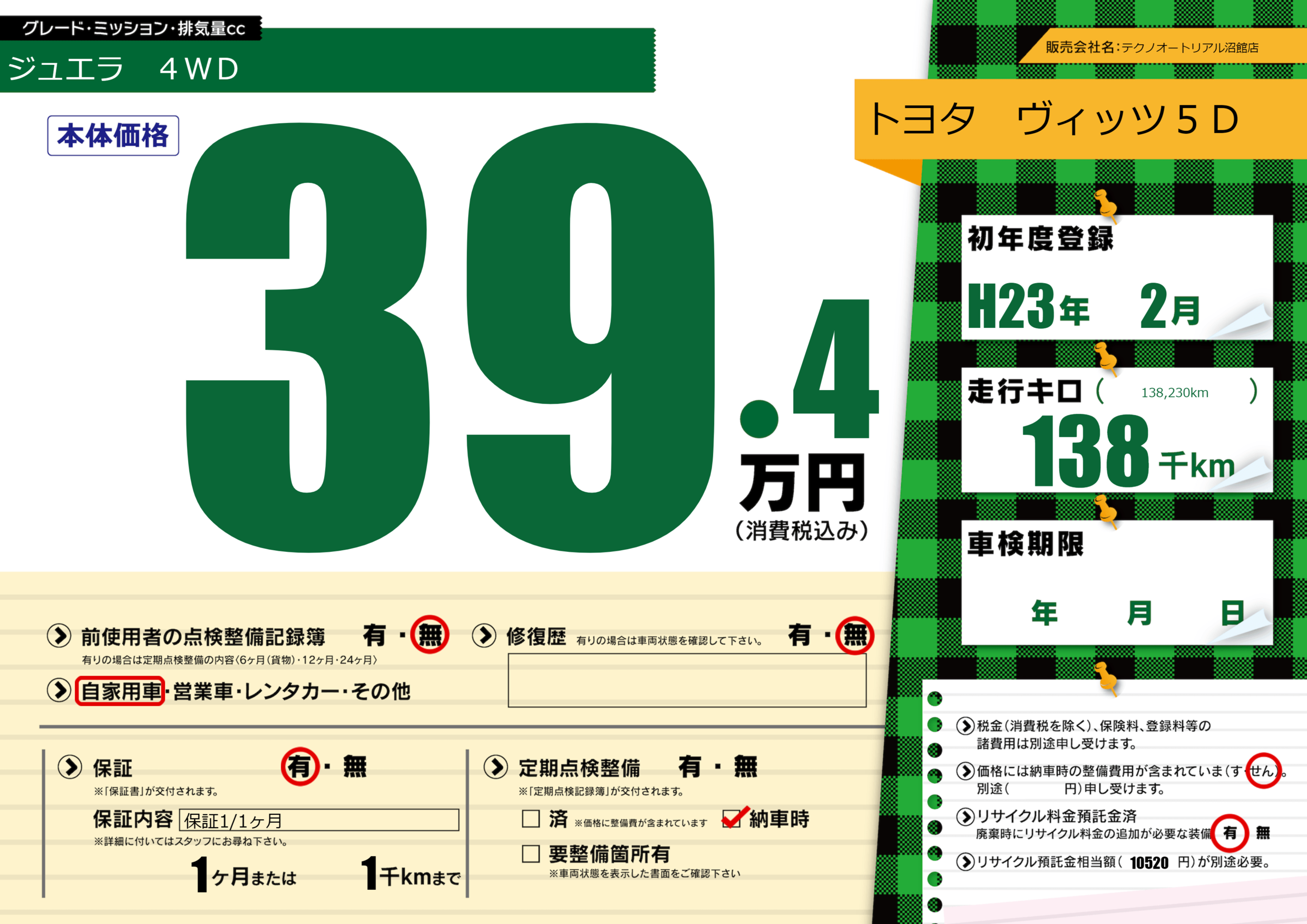 | 車名 | トヨタ ヴィッツ5D | グレード ミッション 排気量 |