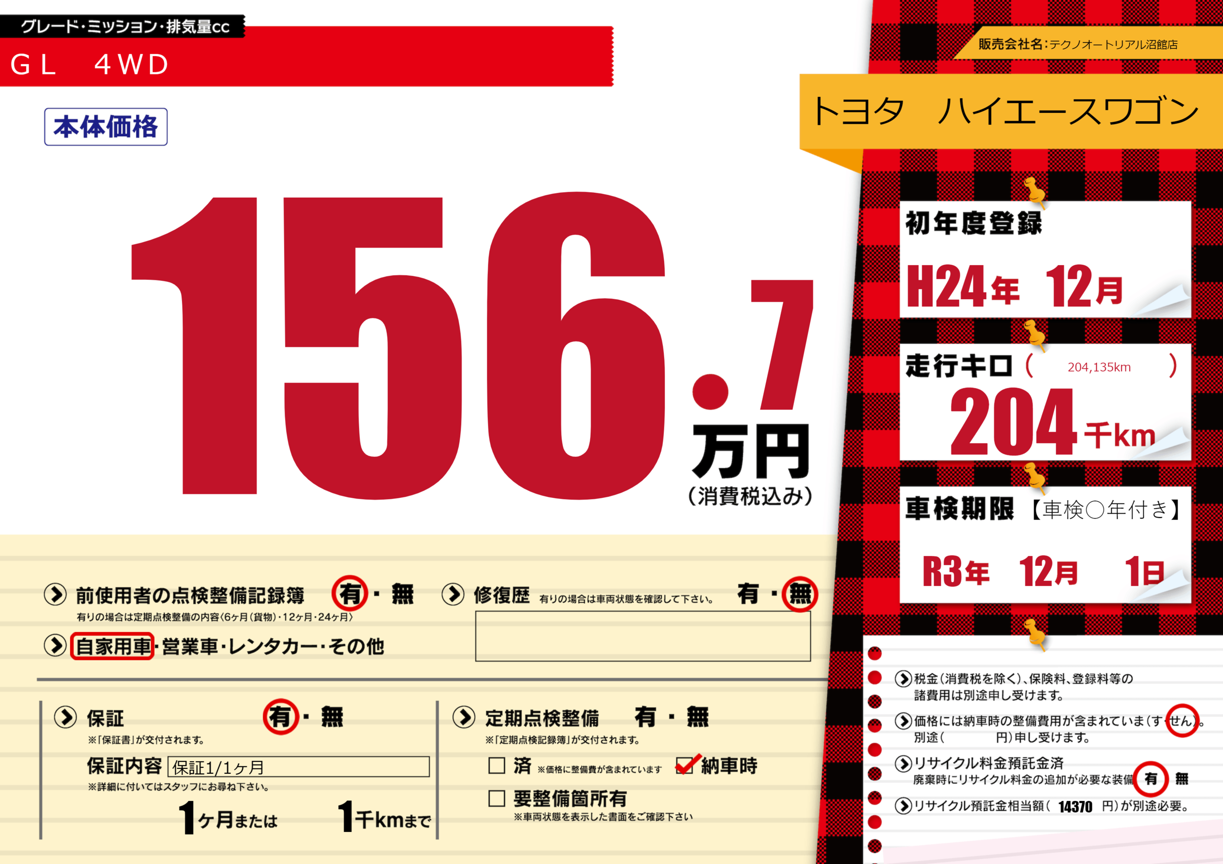 | 走行キロ | 20.4万km | 初年度登録 | H24年12月 |