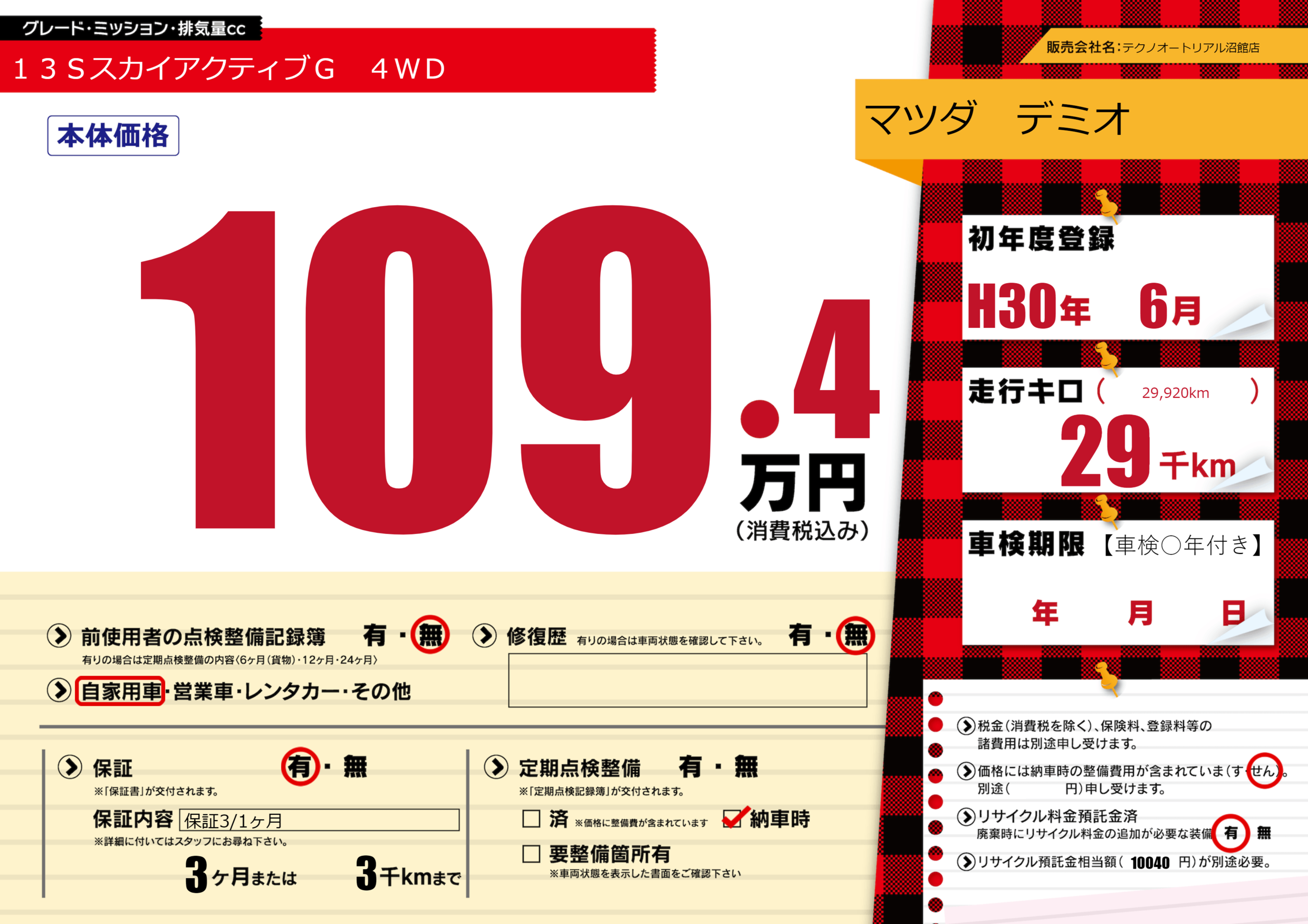 | 車名 | マツダ デミオ | グレード ミッション 排気量 |