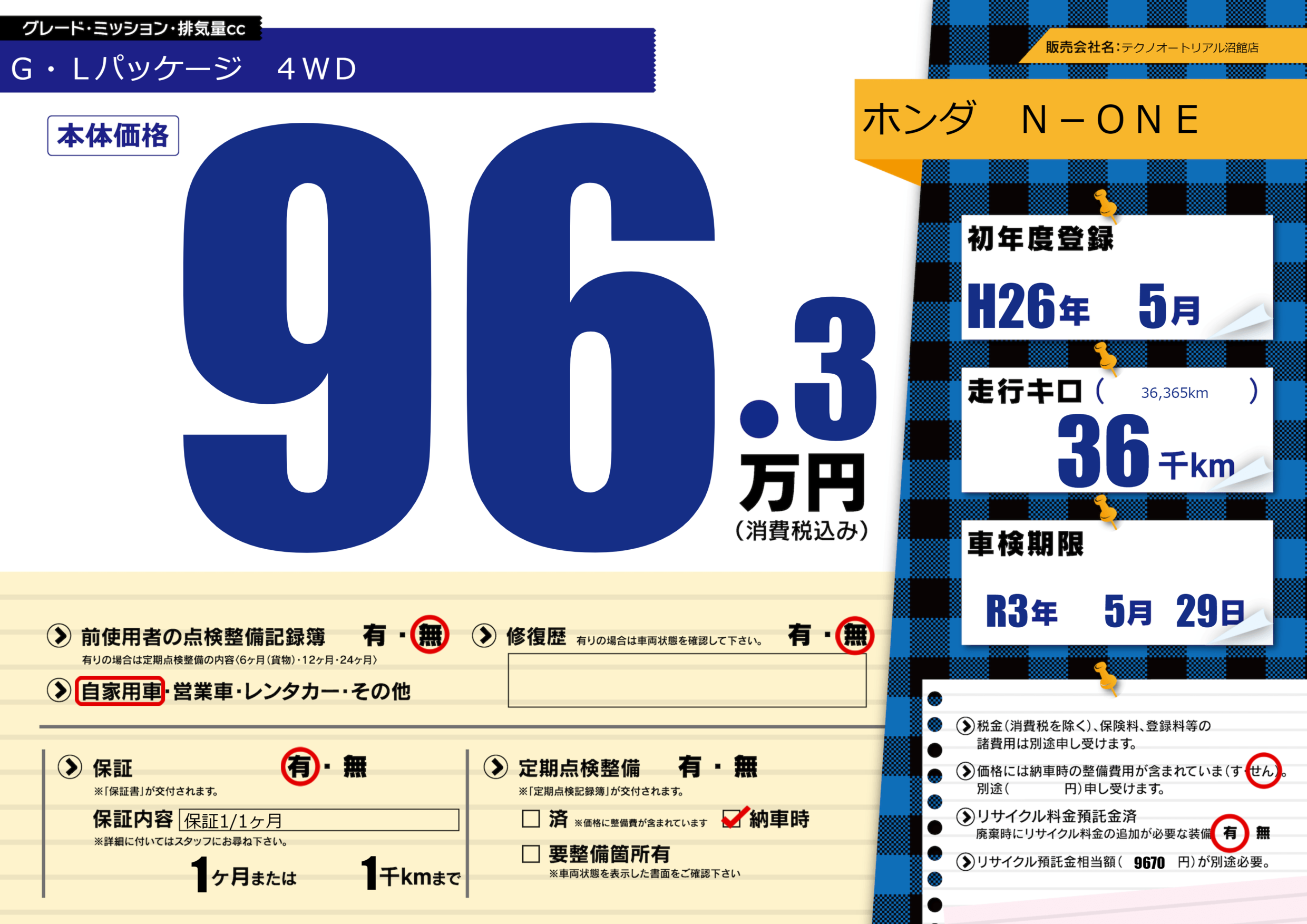 | 車名 | ホンダ N-ONE | グレード ミッション 排気量 |