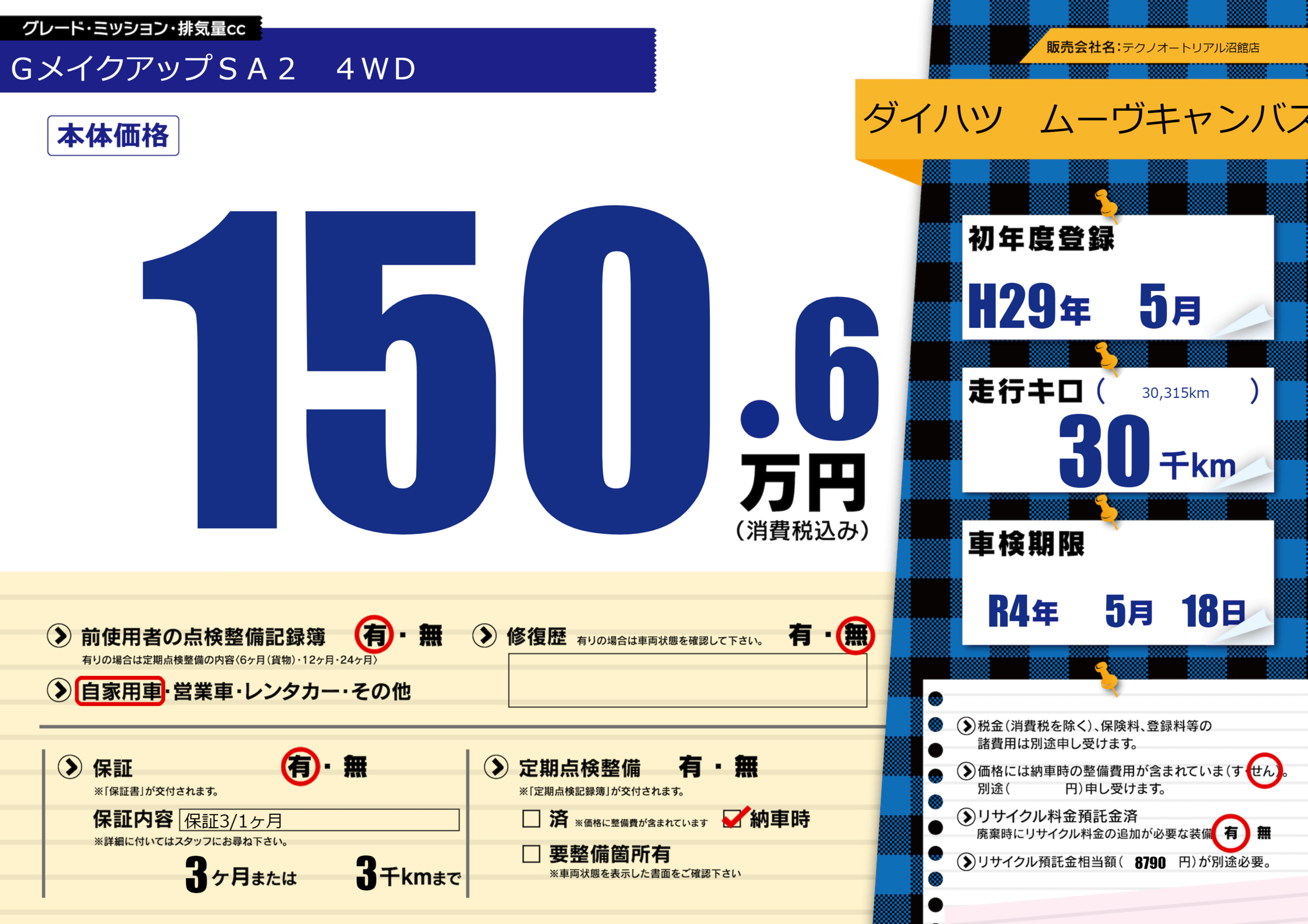 | 車名 | ダイハツ ムーヴキャンバス | グレード ミッション 排気量 |