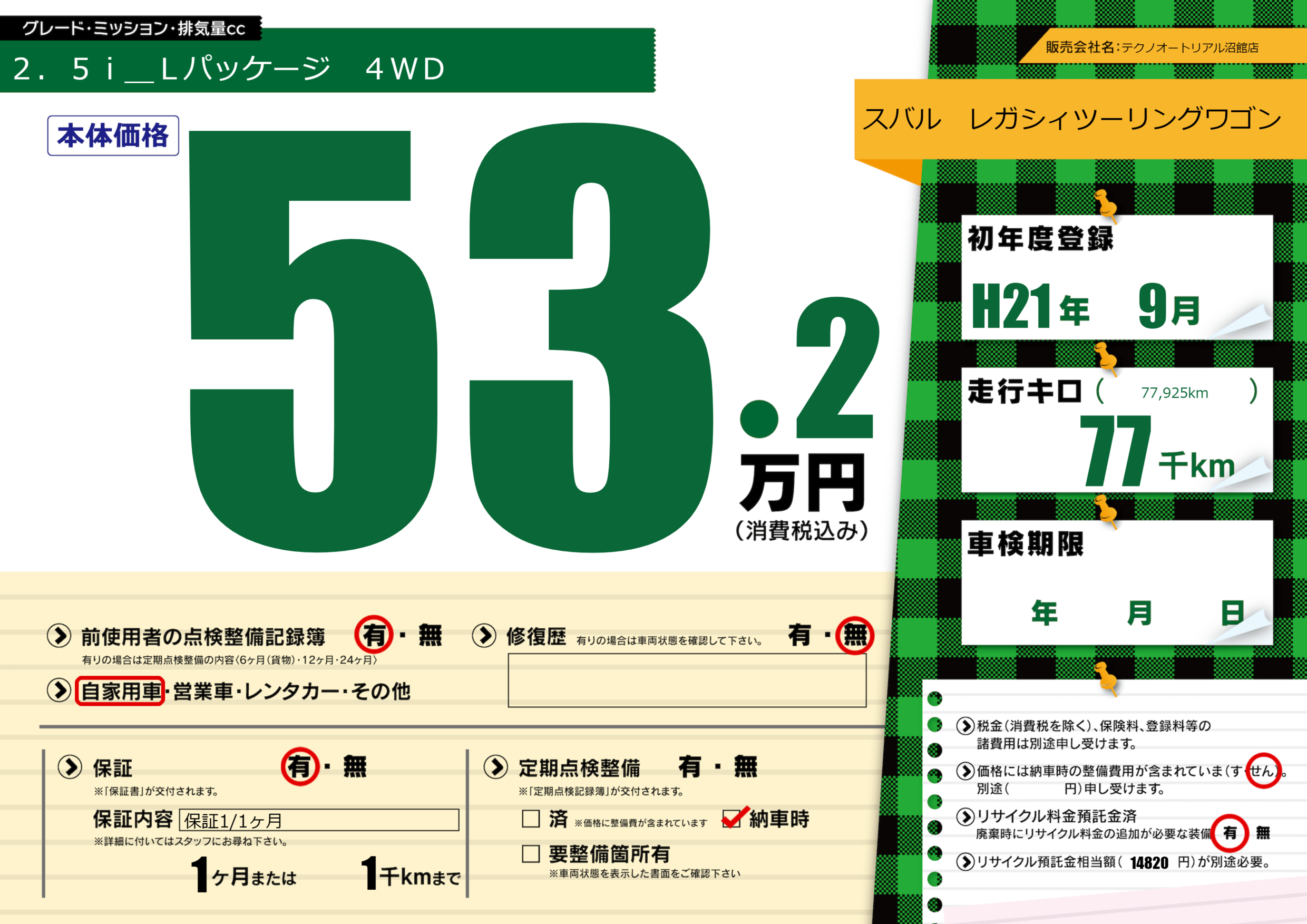 | 車名 | スバル レガシィツーリングワゴン | グレード ミッション 排気量 |