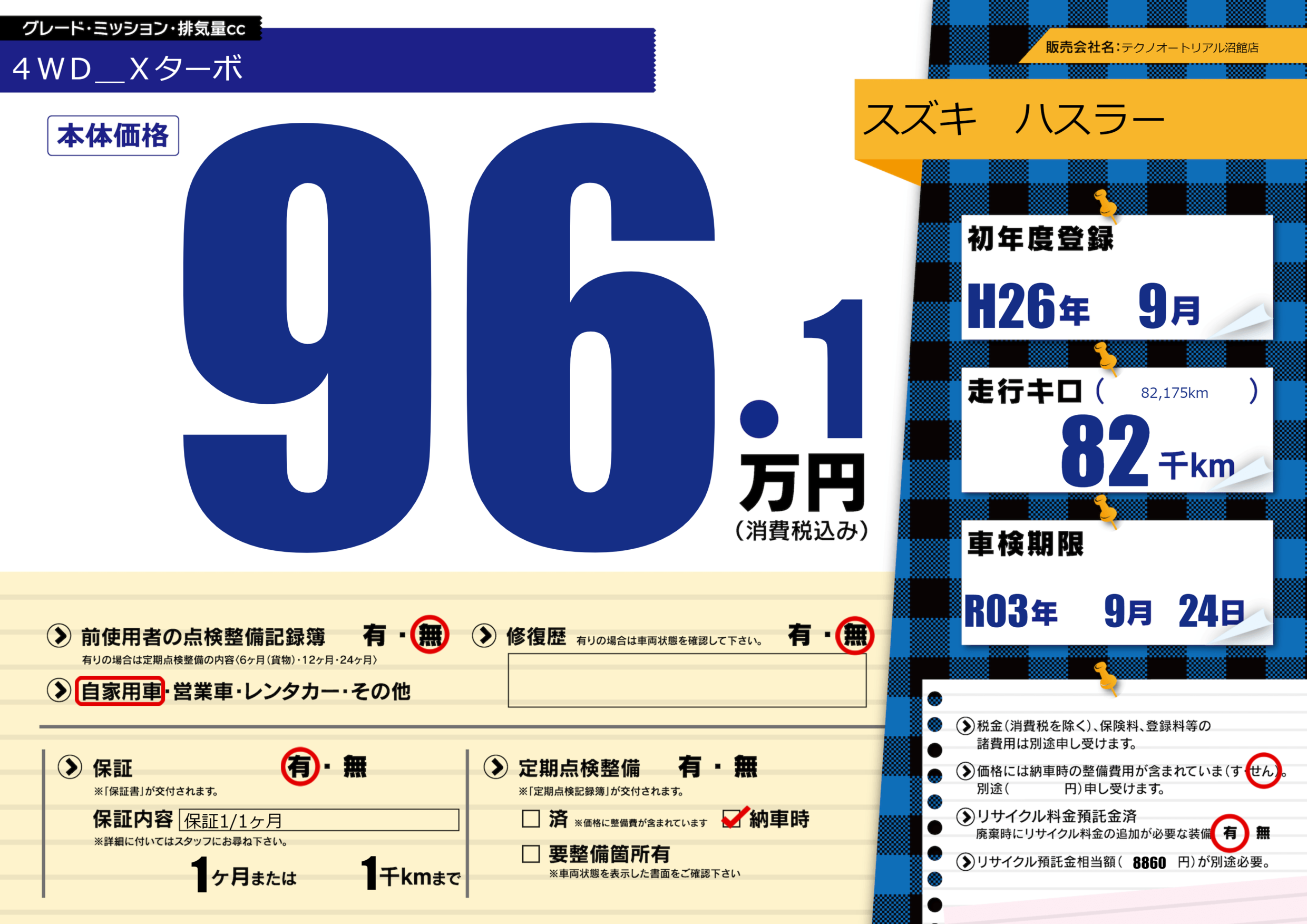 保証付き 保証内容(保証1/1ヶ月) 1ヶ月または(1)千kmまで |