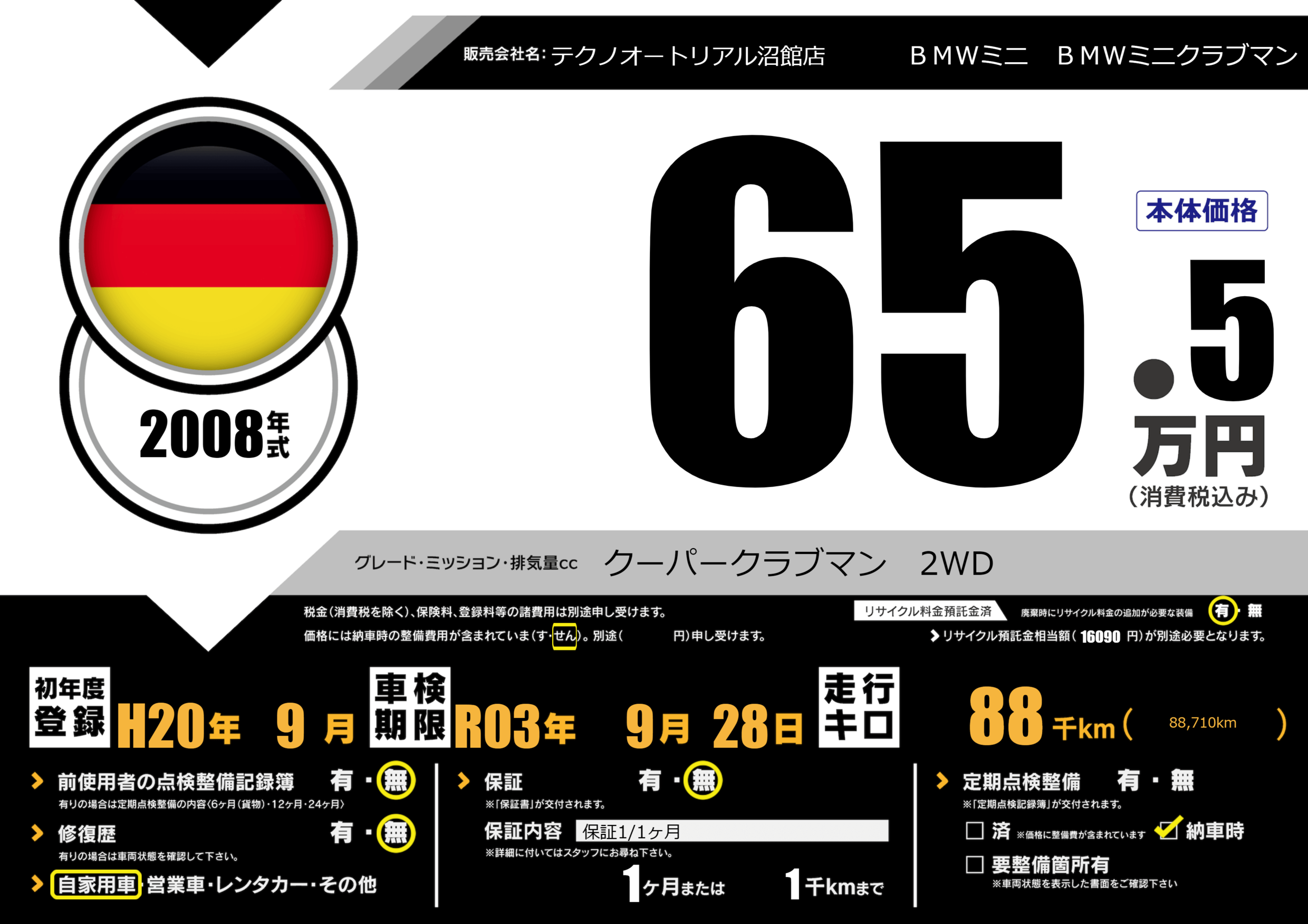 | 車名 | BMWミニ BMWミニクラブマン | グレード ミッション 排気量 |