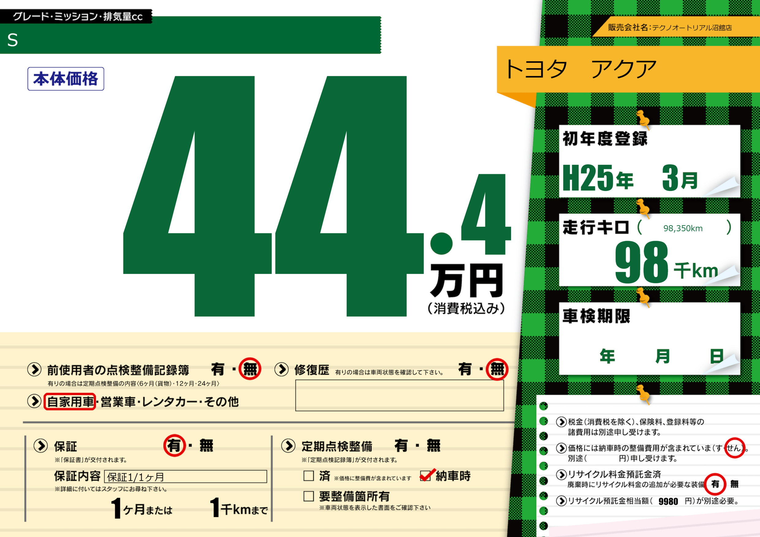 | 車名 | トヨタ アクア | グレード ミッション 排気量 |