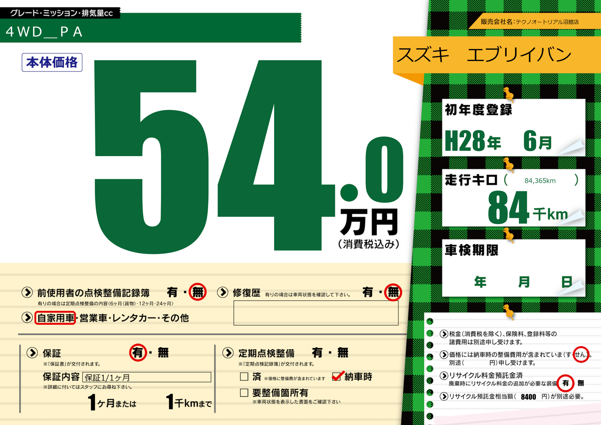 | 車名 | スズキ エブリイバン | グレード ミッション 排気量 |