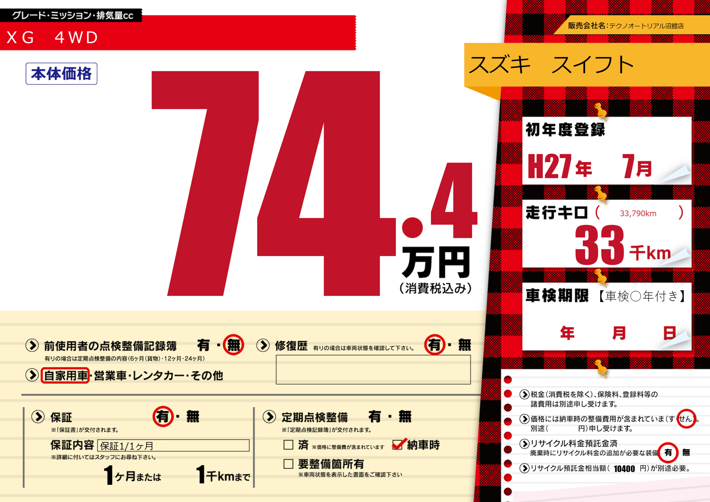 | 車名 | スズキ スイフト | グレード ミッション 排気量 |