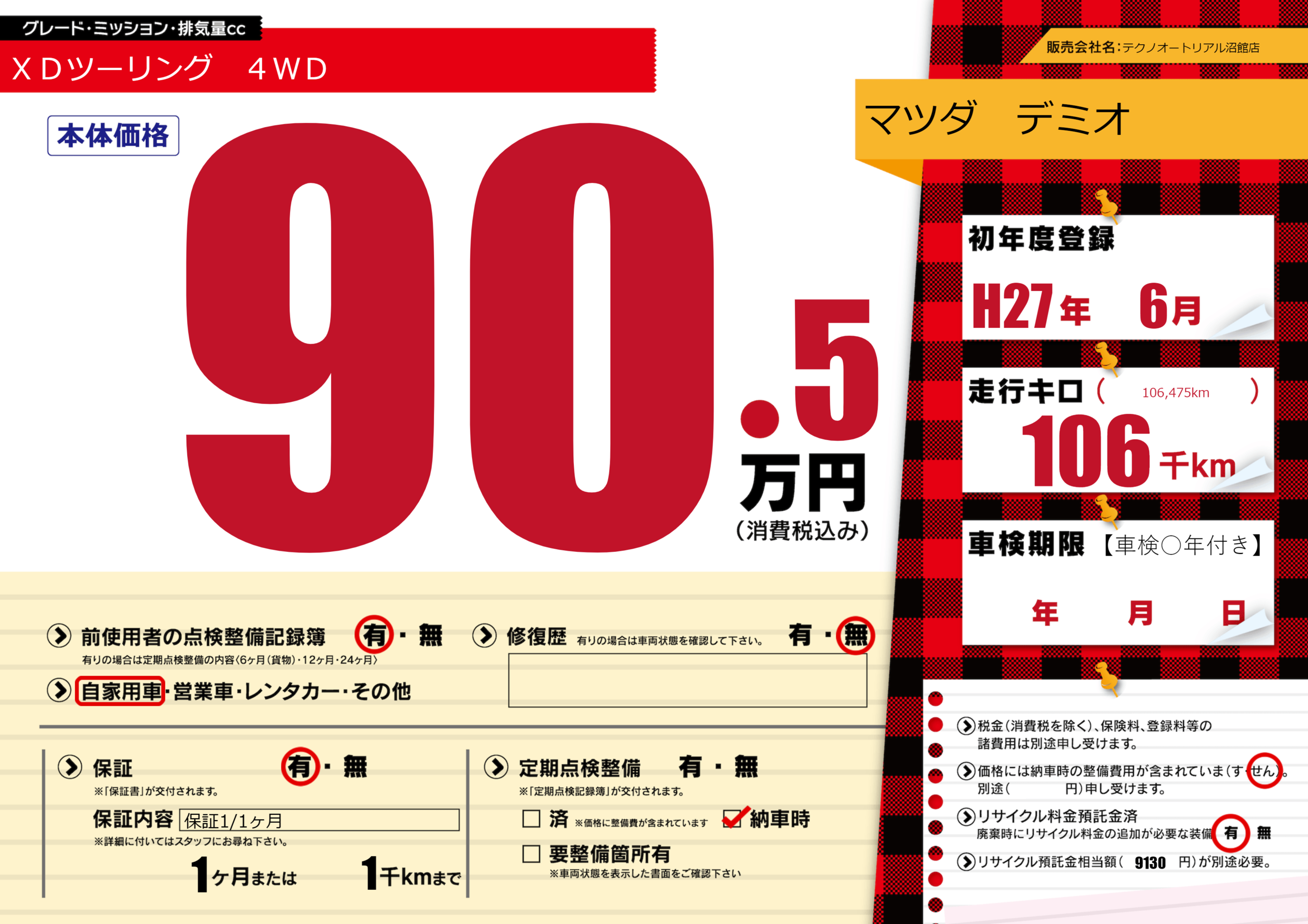 | 車名 | マツダ デミオ | グレード ミッション 排気量 |