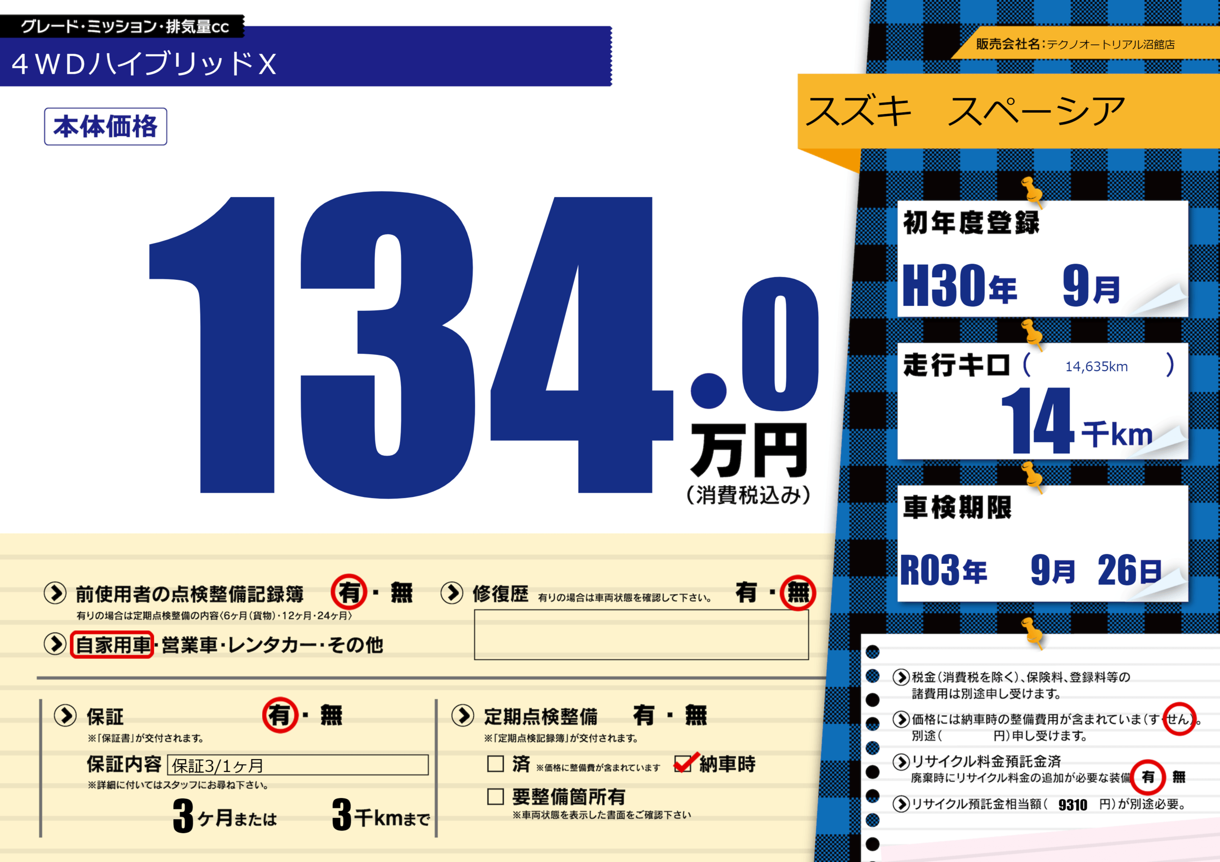 | 走行キロ | 1.4万km | 初年度登録 | H30年9月 |