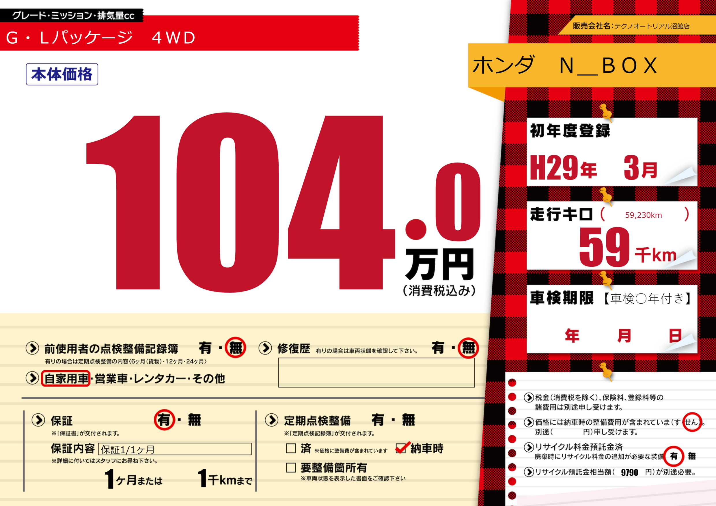 | 車名 | ホンダ N_BOX | グレード ミッション 排気量 |