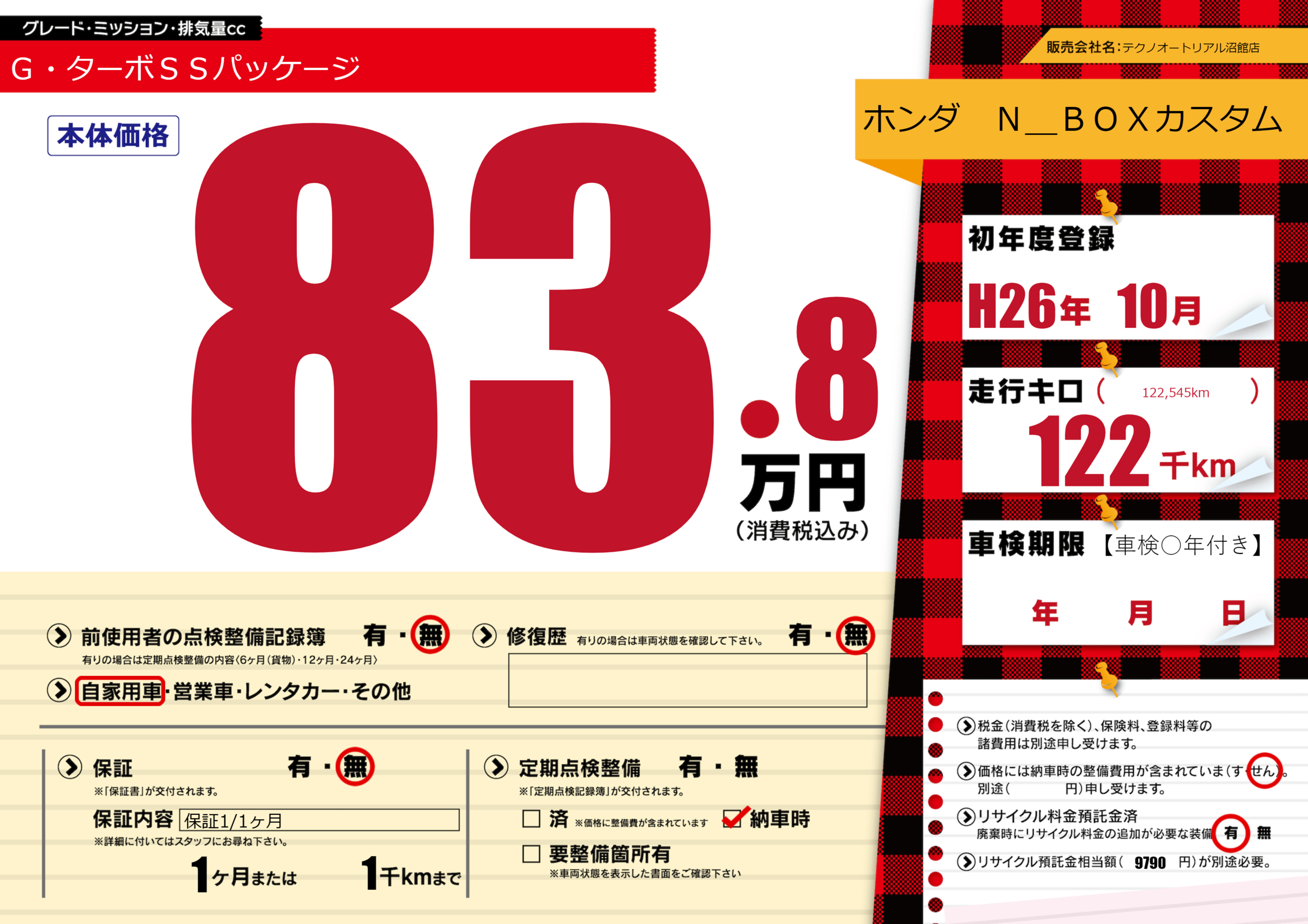 | 走行キロ | 12.2万km | 初年度登録 | H26年10月 |