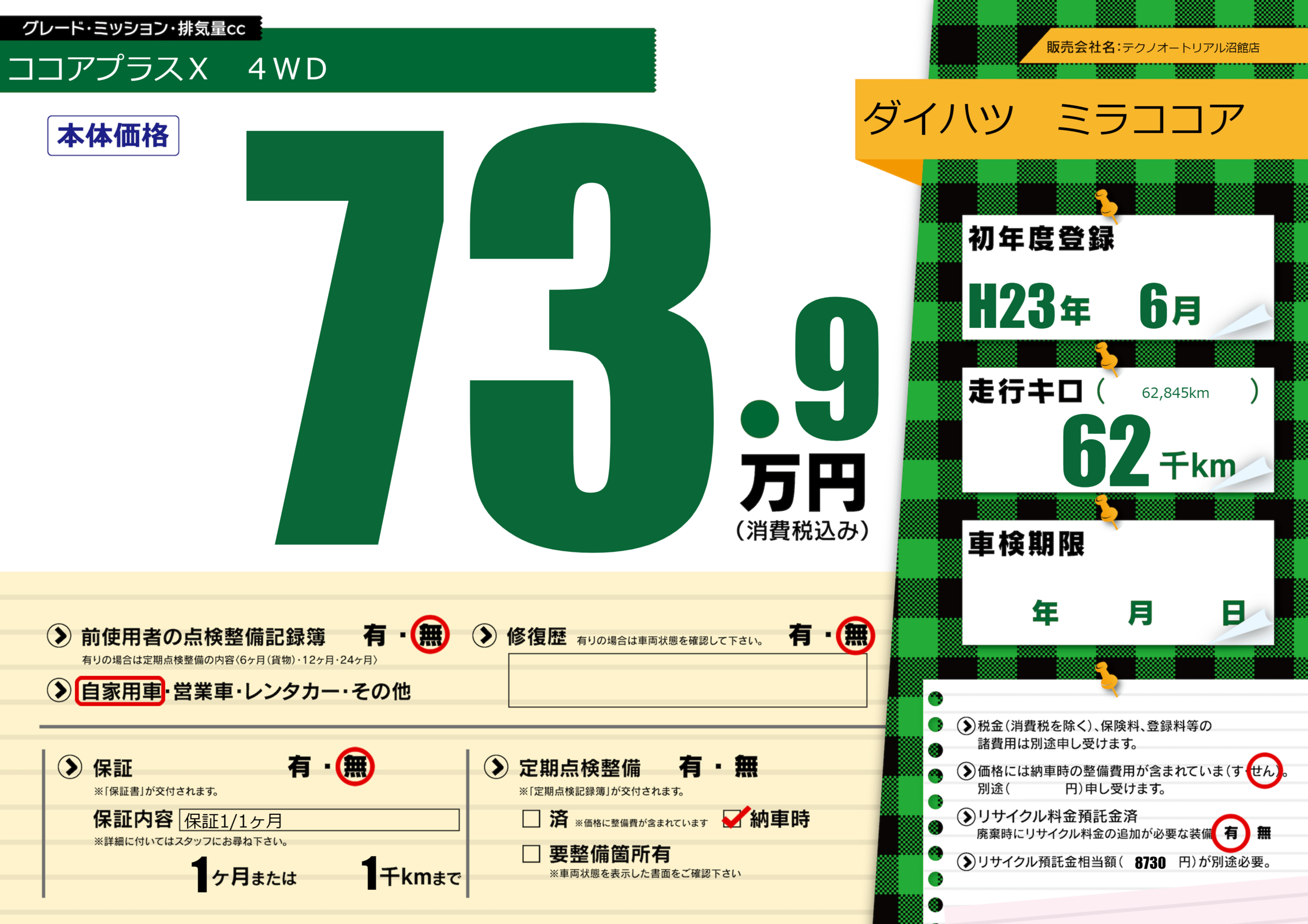 | 車名 | ダイハツ ミラココア | グレード ミッション 排気量 |
