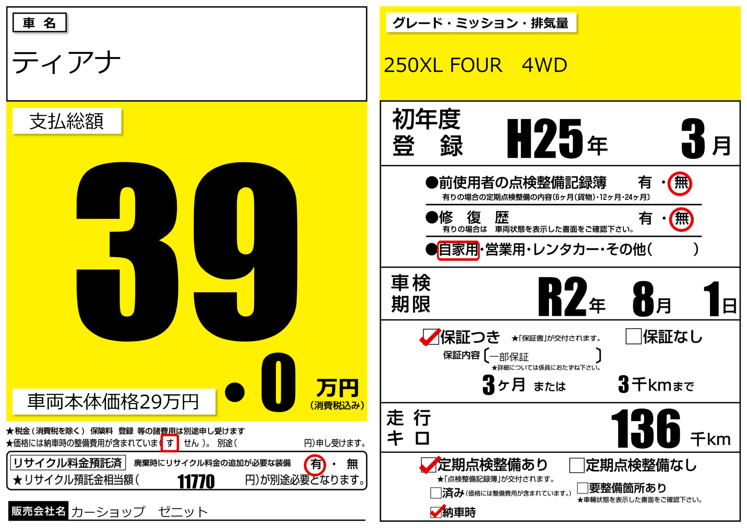 | 車名 | ティアナ | グレード ミッション 排気量 |