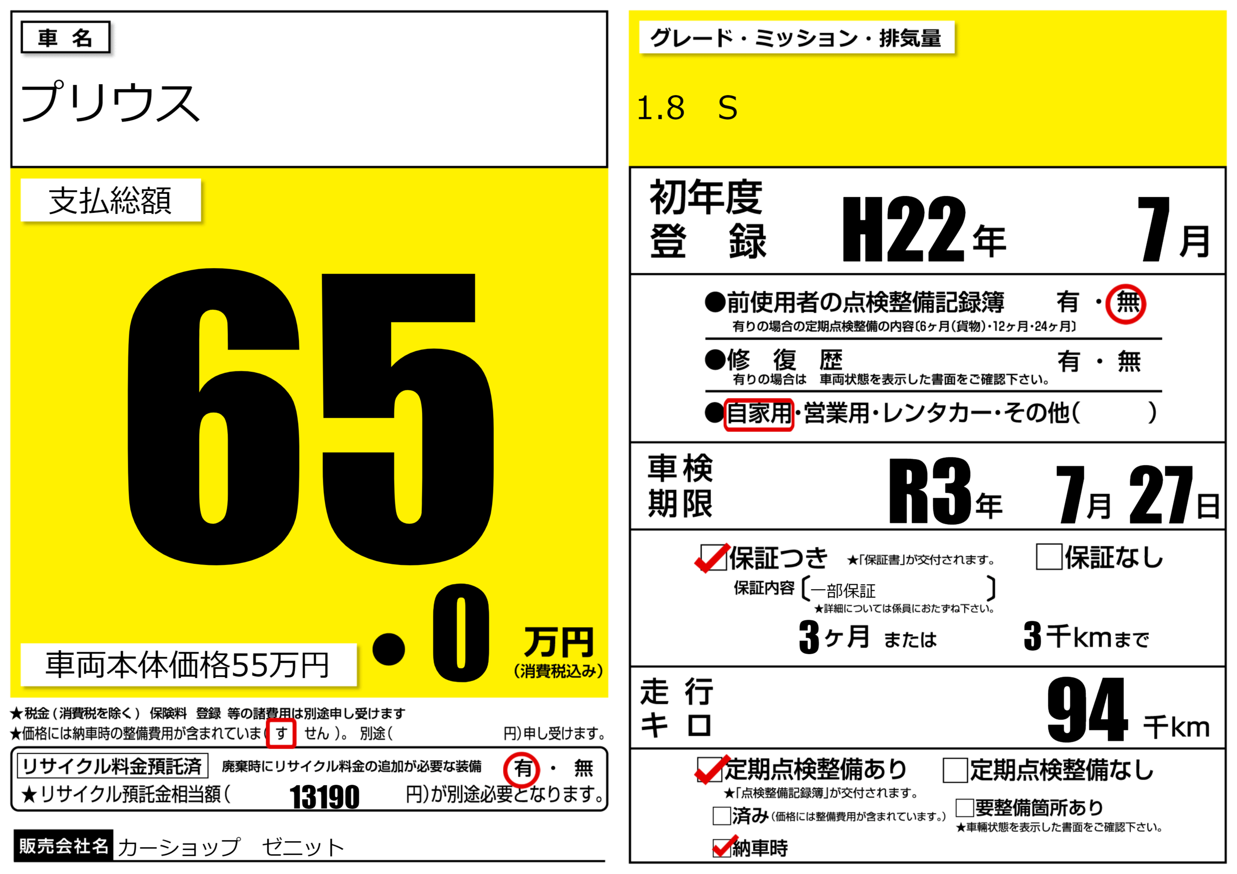 | 車名 | プリウス | グレード ミッション 排気量 |