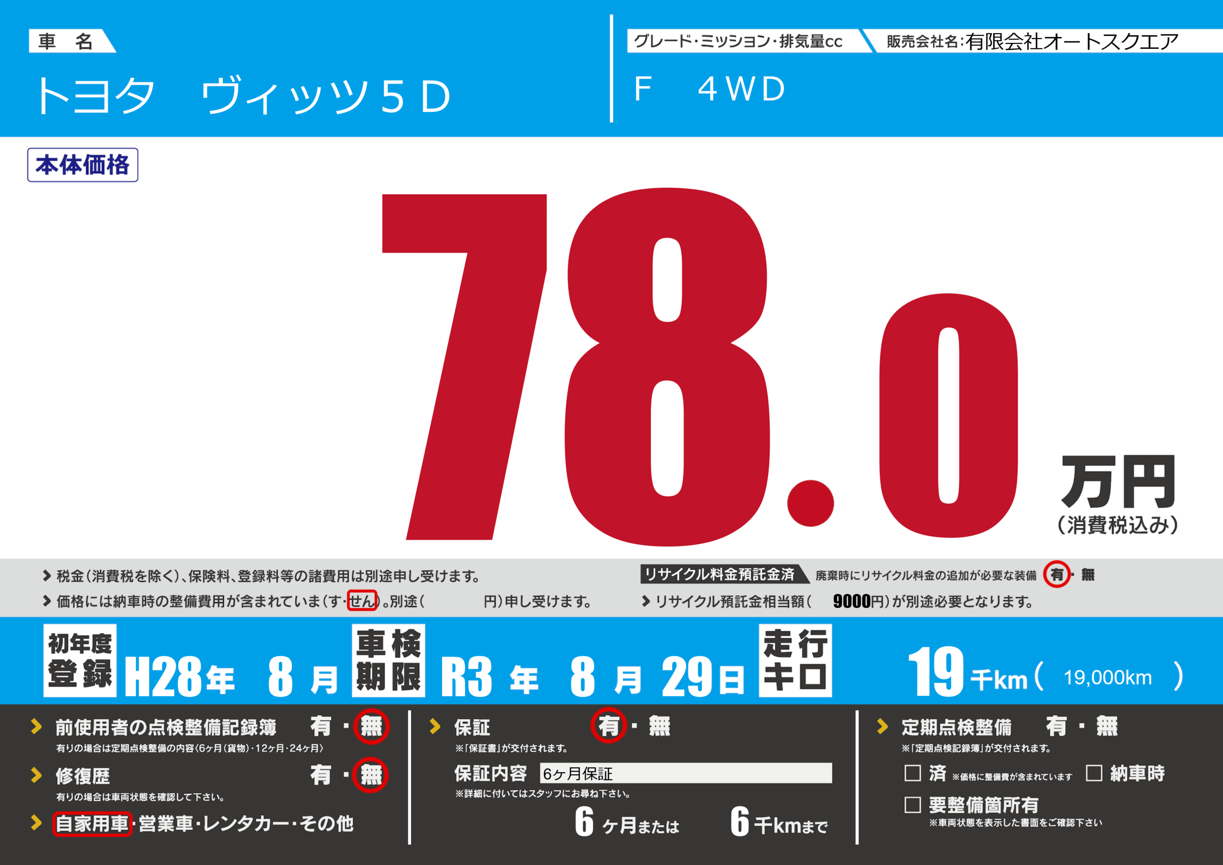 | 車名 | トヨタ ヴィッツ5D | グレード ミッション 排気量 |