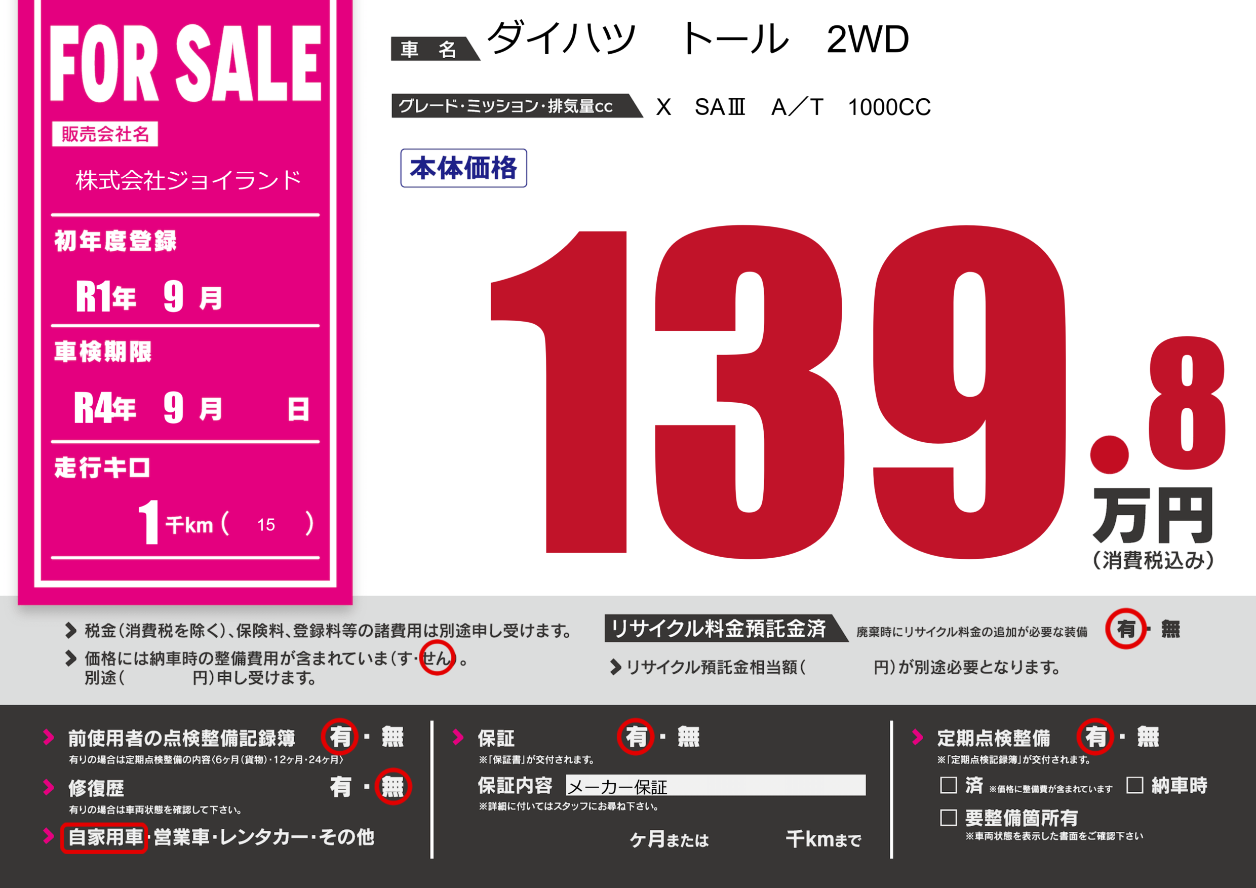 | 車名 | ダイハツ トール 2WD | グレード ミッション 排気量 |