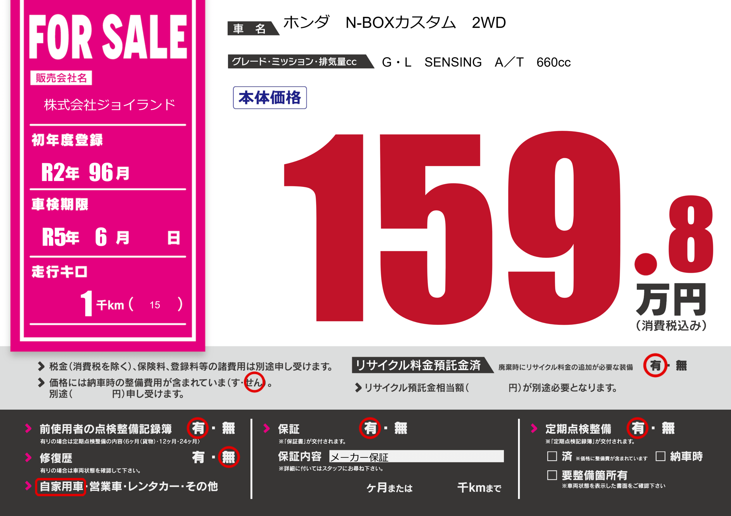 | 車名 | ホンダ N-BOXカスタム 2WD | グレード ミッション 排気量 |