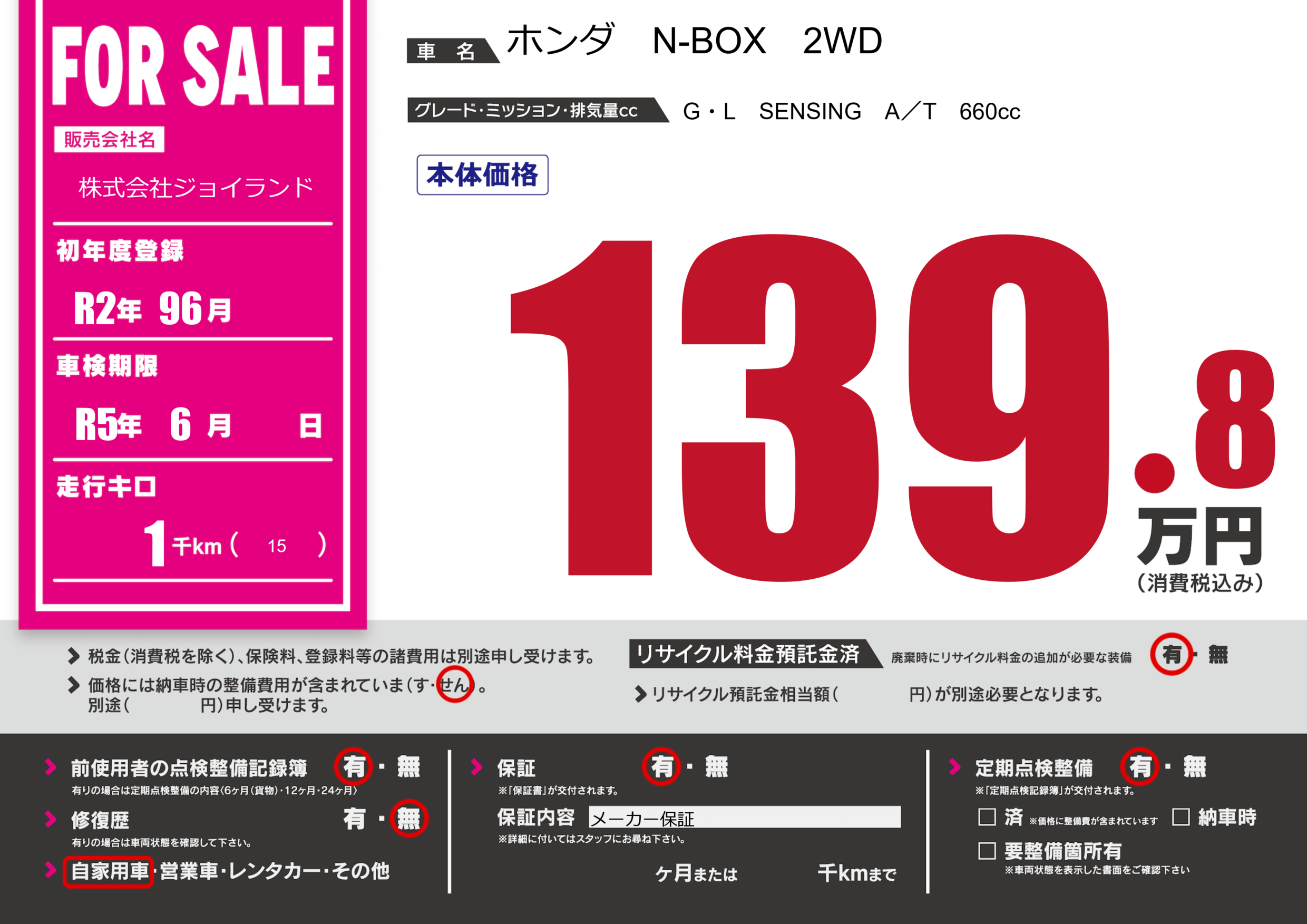 | 車名 | ホンダ N-BOX 2WD | グレード ミッション 排気量 |