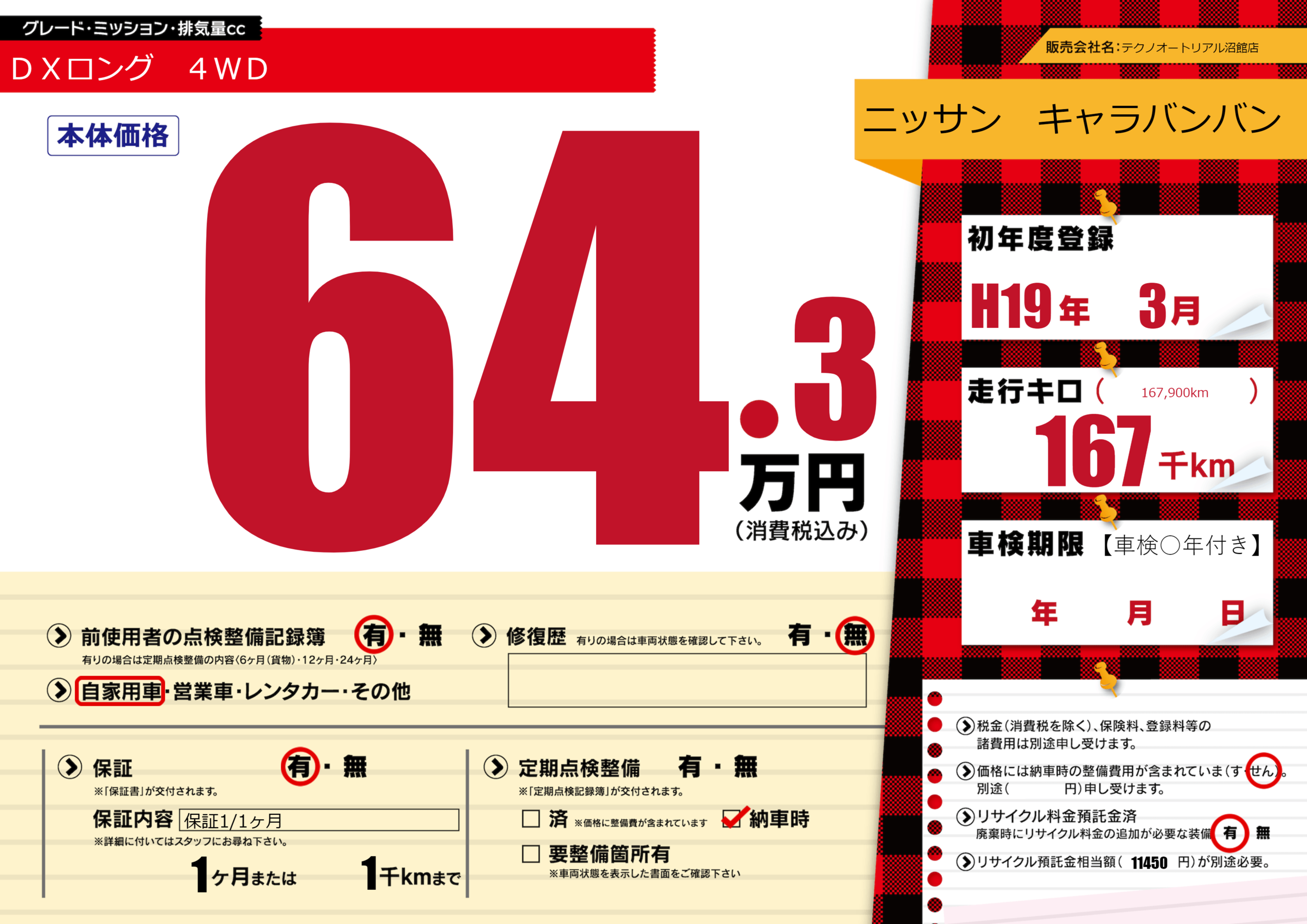 | 車名 | ニッサン キャラバンバン | グレード ミッション 排気量 |