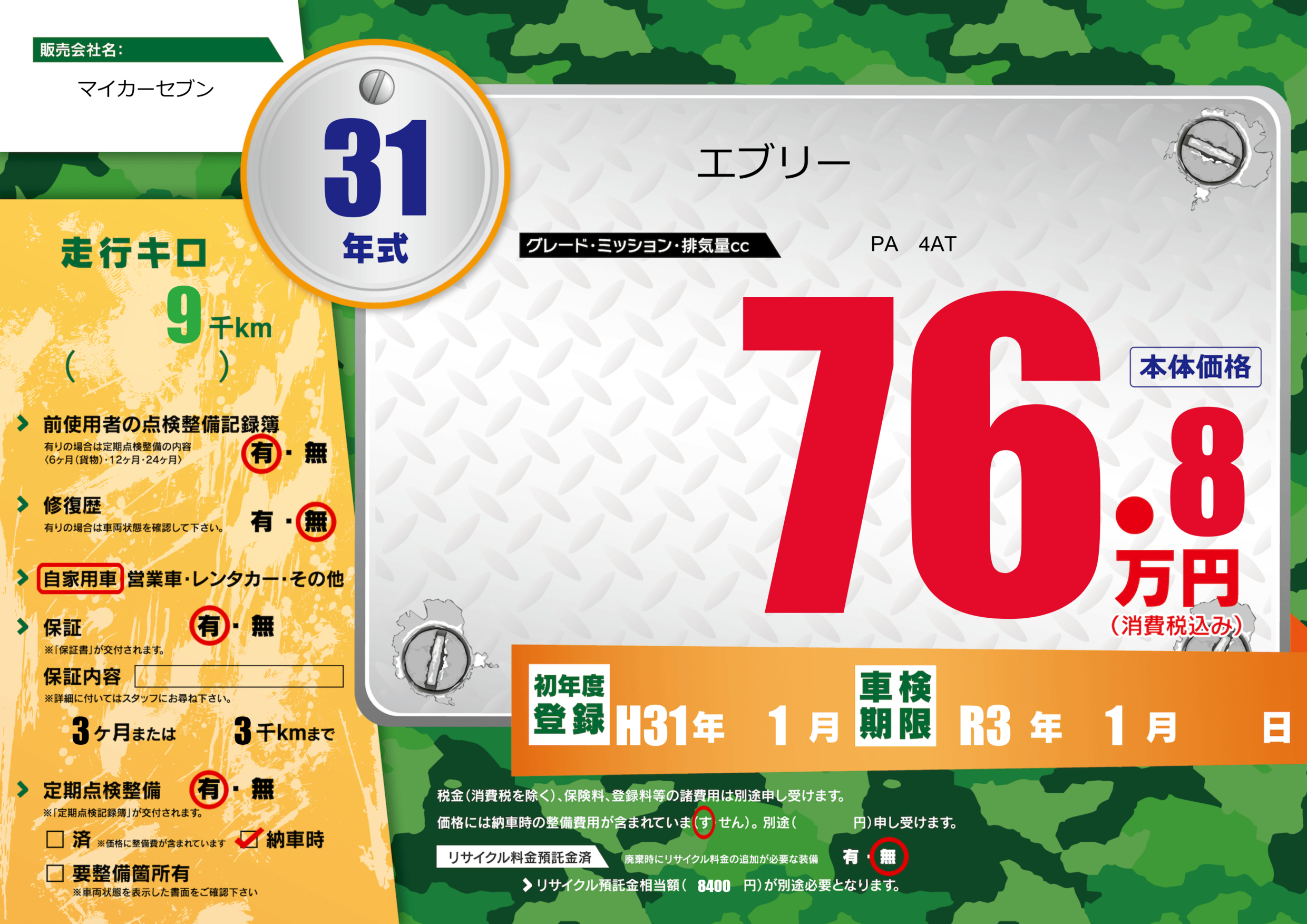 | 車検制限 | R3年 1月 - 日 | ||