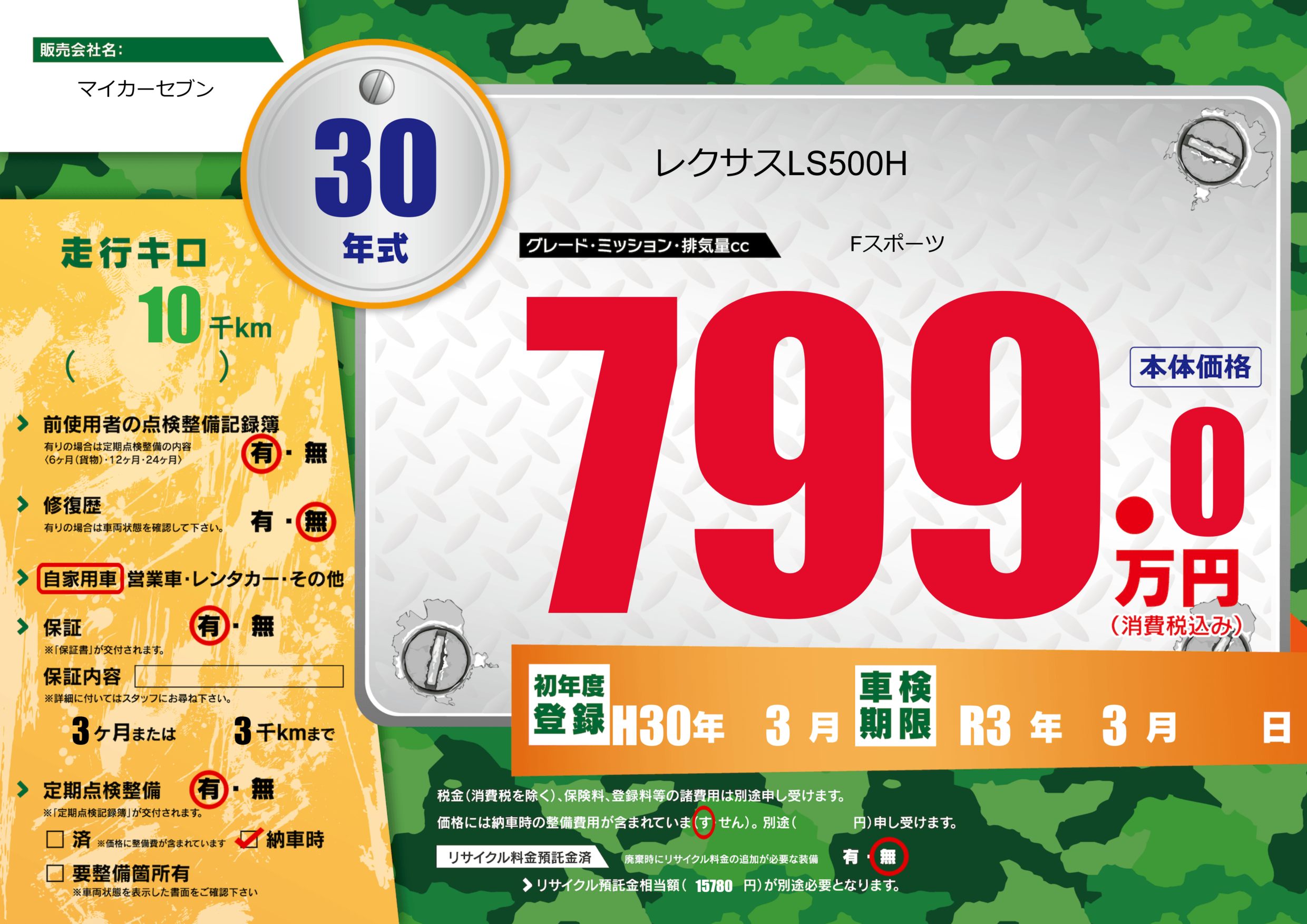 | 車名 | レクサスLS500H | グレード ミッション 排気量 |