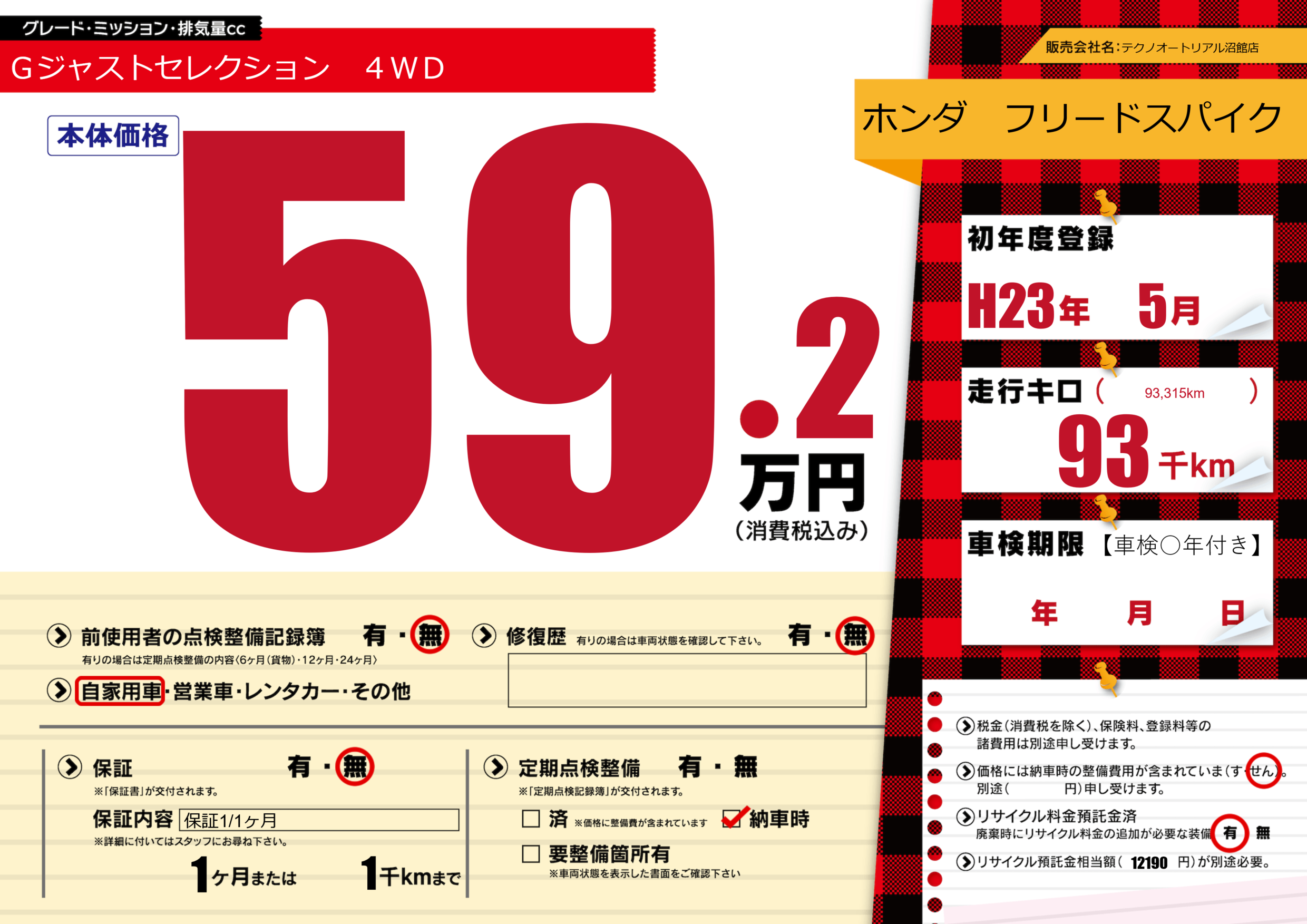 | 車名 | ホンダ フリードスパイク | グレード ミッション 排気量 |