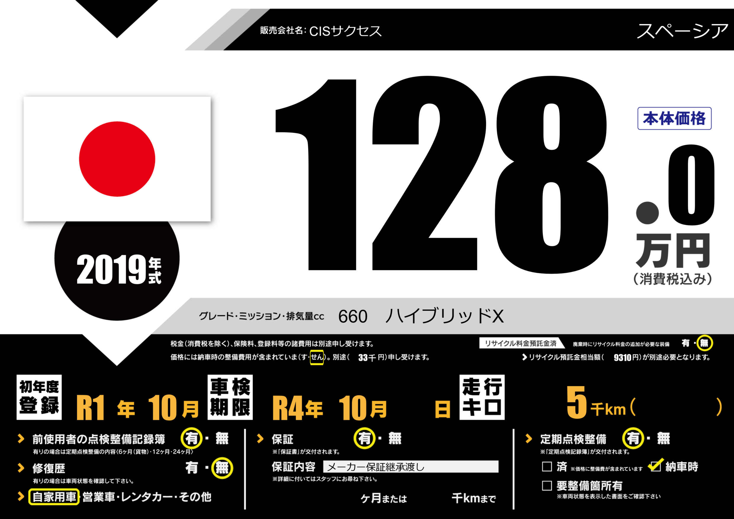 | 車名 | スペーシア | グレード ミッション 排気量 |