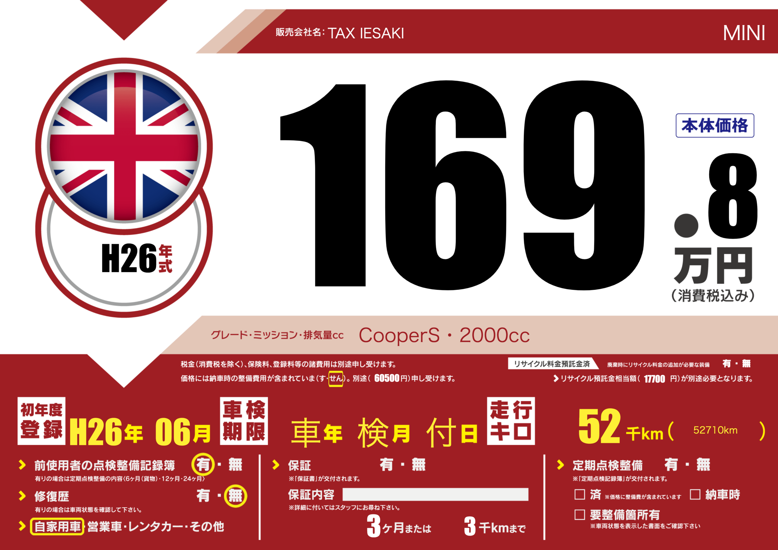 | 走行キロ | 5.2万km | 初年度登録 | H26年06月 |