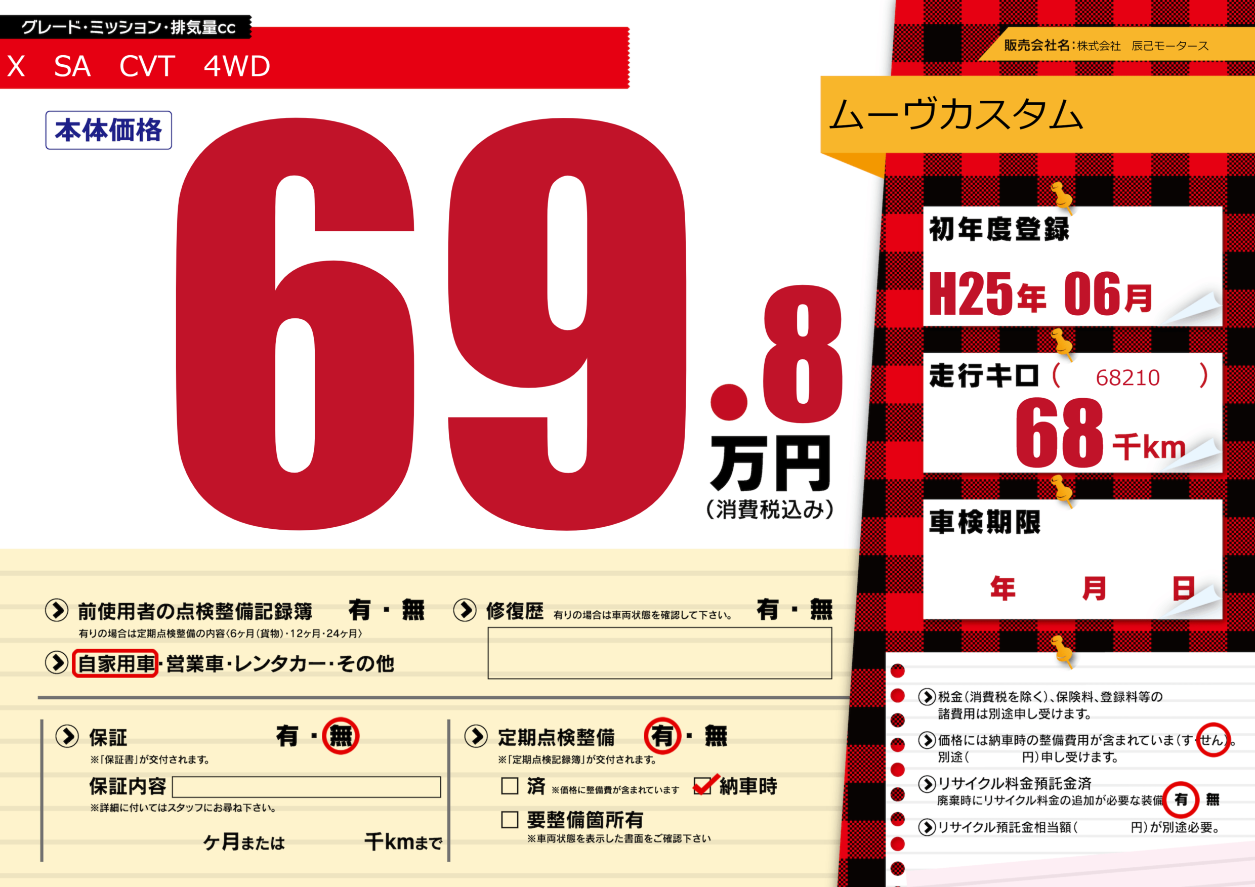 | 走行キロ | 6.8万km | 初年度登録 | H25年06月 |