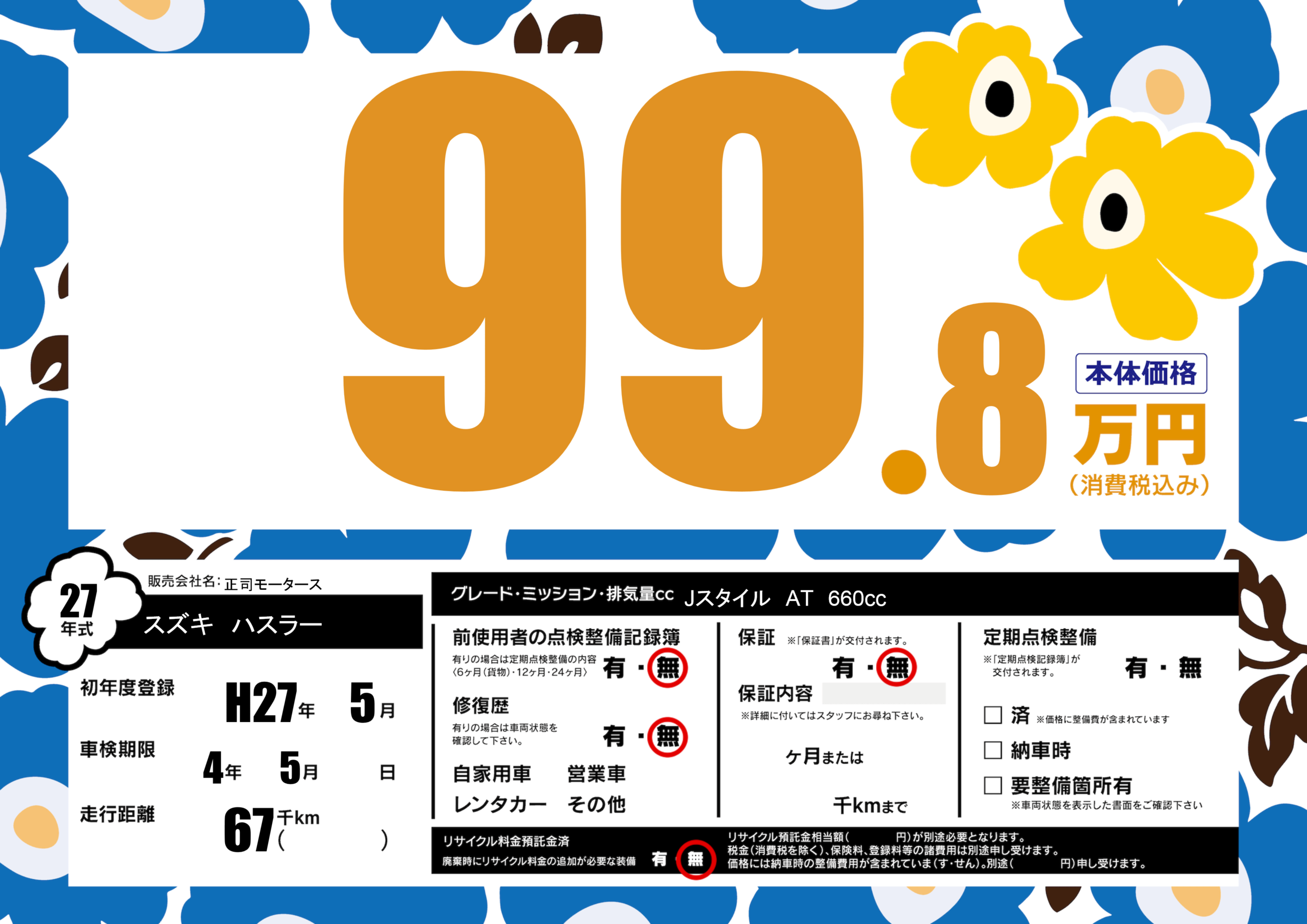 | 車名 | スズキ ハスラー | グレード ミッション 排気量 |