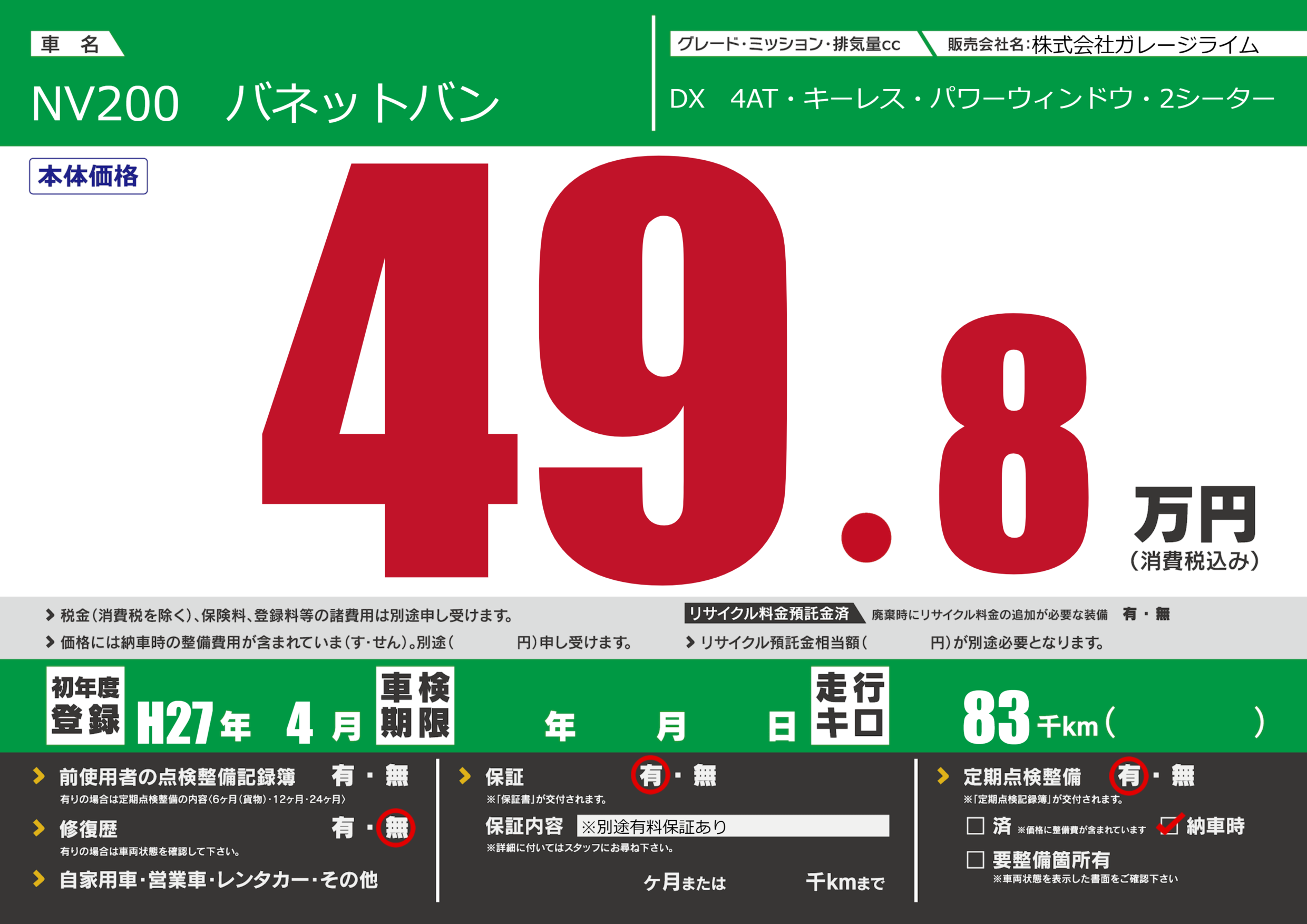 | 車名 | NV200 バネットバン | グレード ミッション 排気量 |