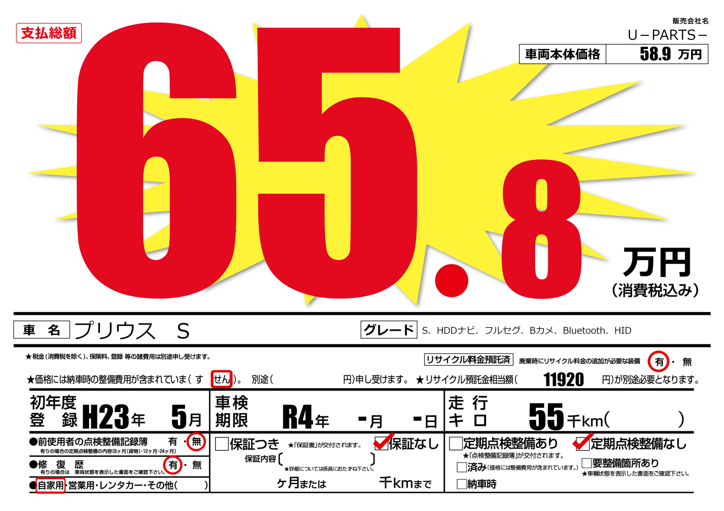 | 車名 | プリウス S | グレード ミッション 排気量 |