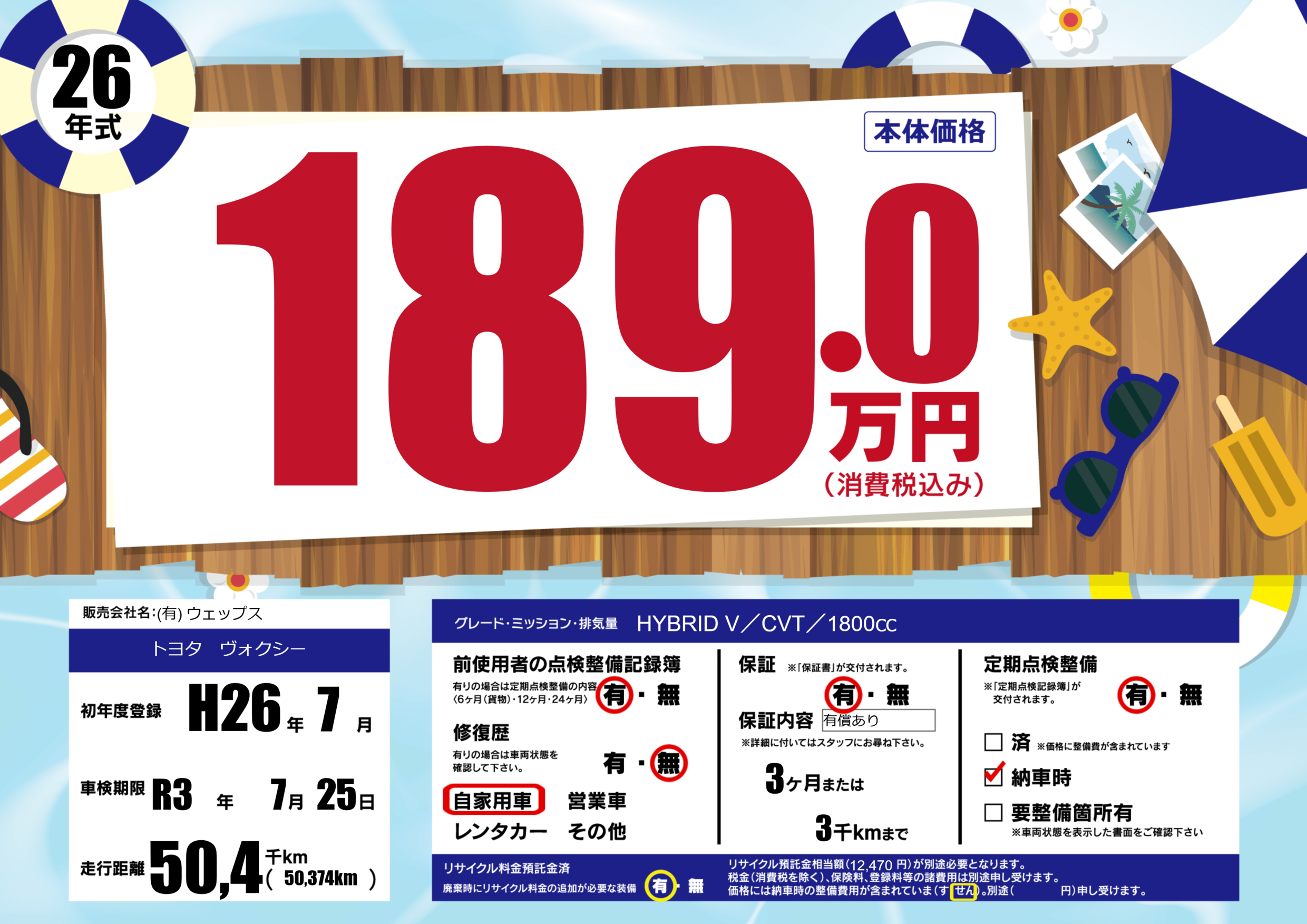 | 走行キロ | 5万km | 初年度登録 | H26年7月 |