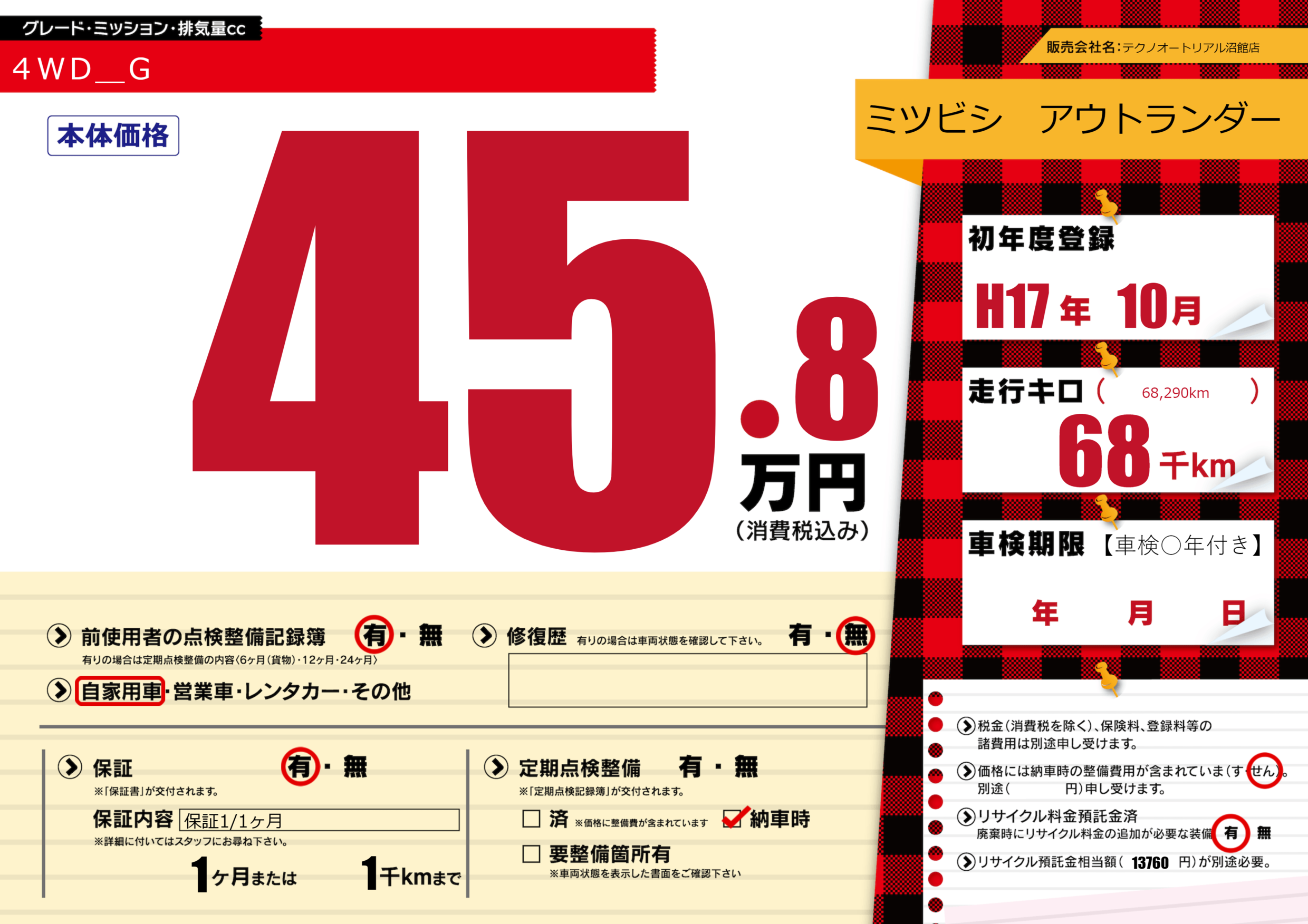 | 走行キロ | 6.8万km | 初年度登録 | H17年10月 |