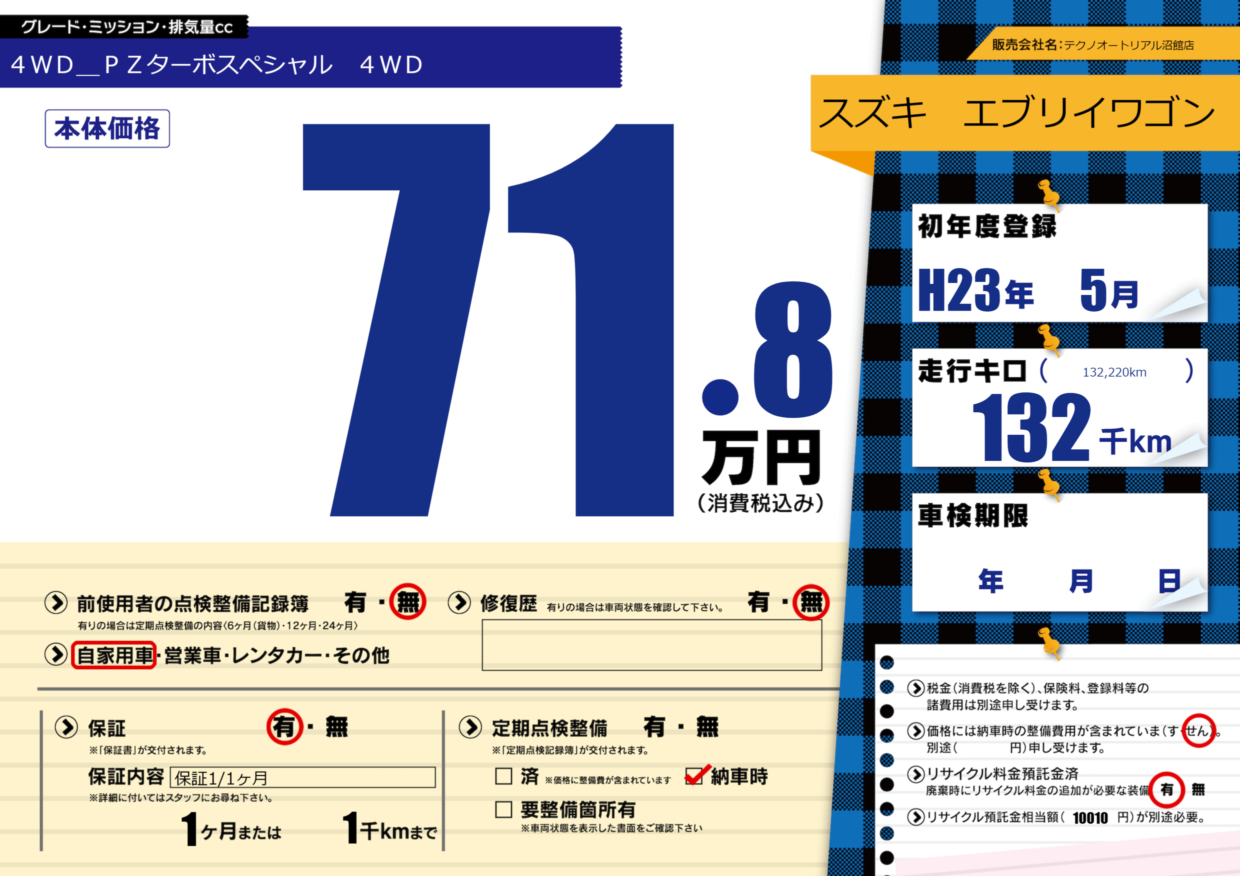 | 車名 | スズキ エブリイワゴン | グレード ミッション 排気量 |