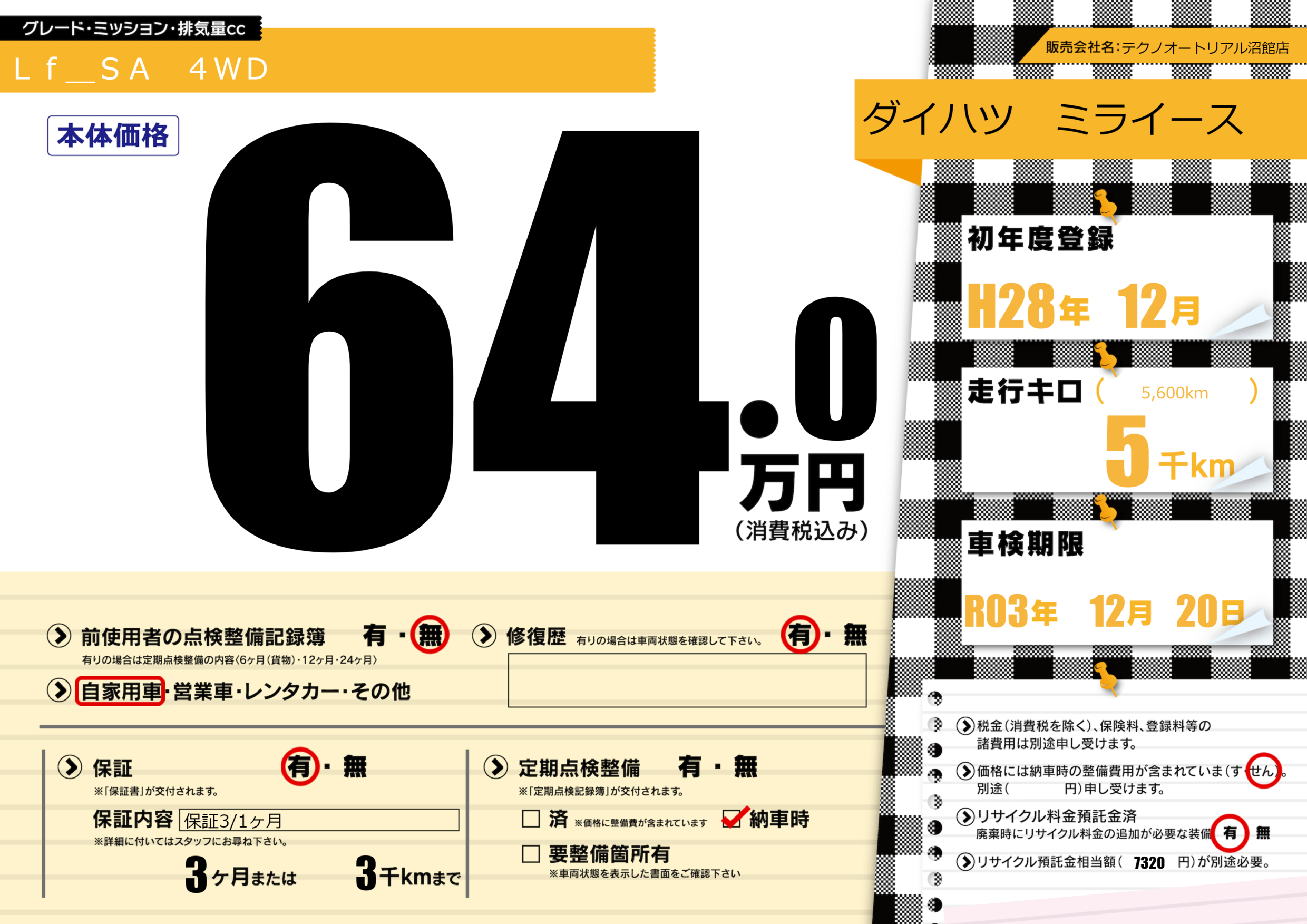| 車名 | ダイハツ ミライース | グレード ミッション 排気量 |