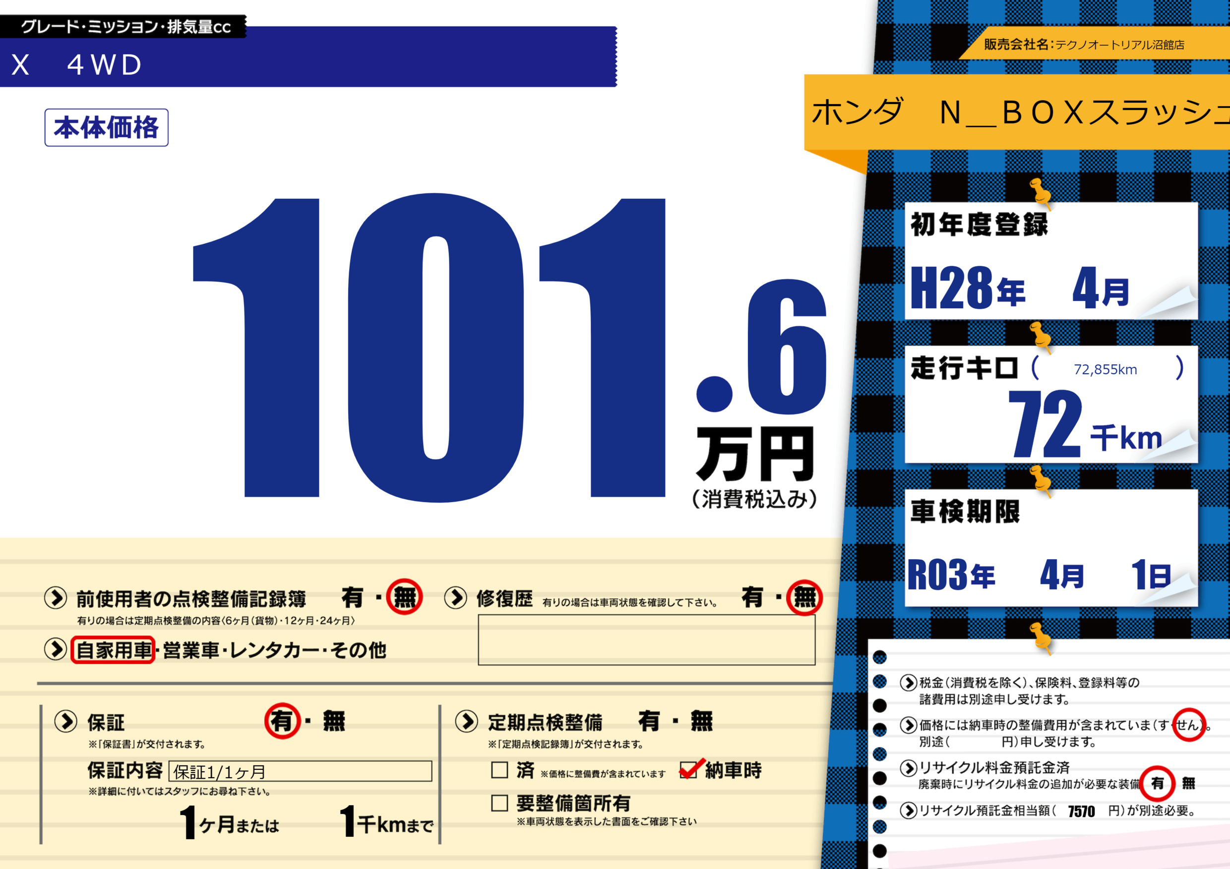 | 車名 | ホンダ N_BOXスラッシュ | グレード ミッション 排気量 |
