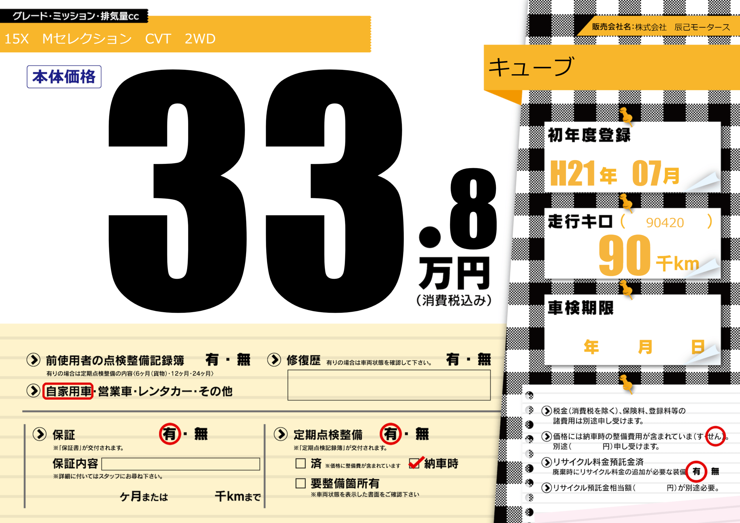 | 車名 | キューブ | グレード ミッション 排気量 |