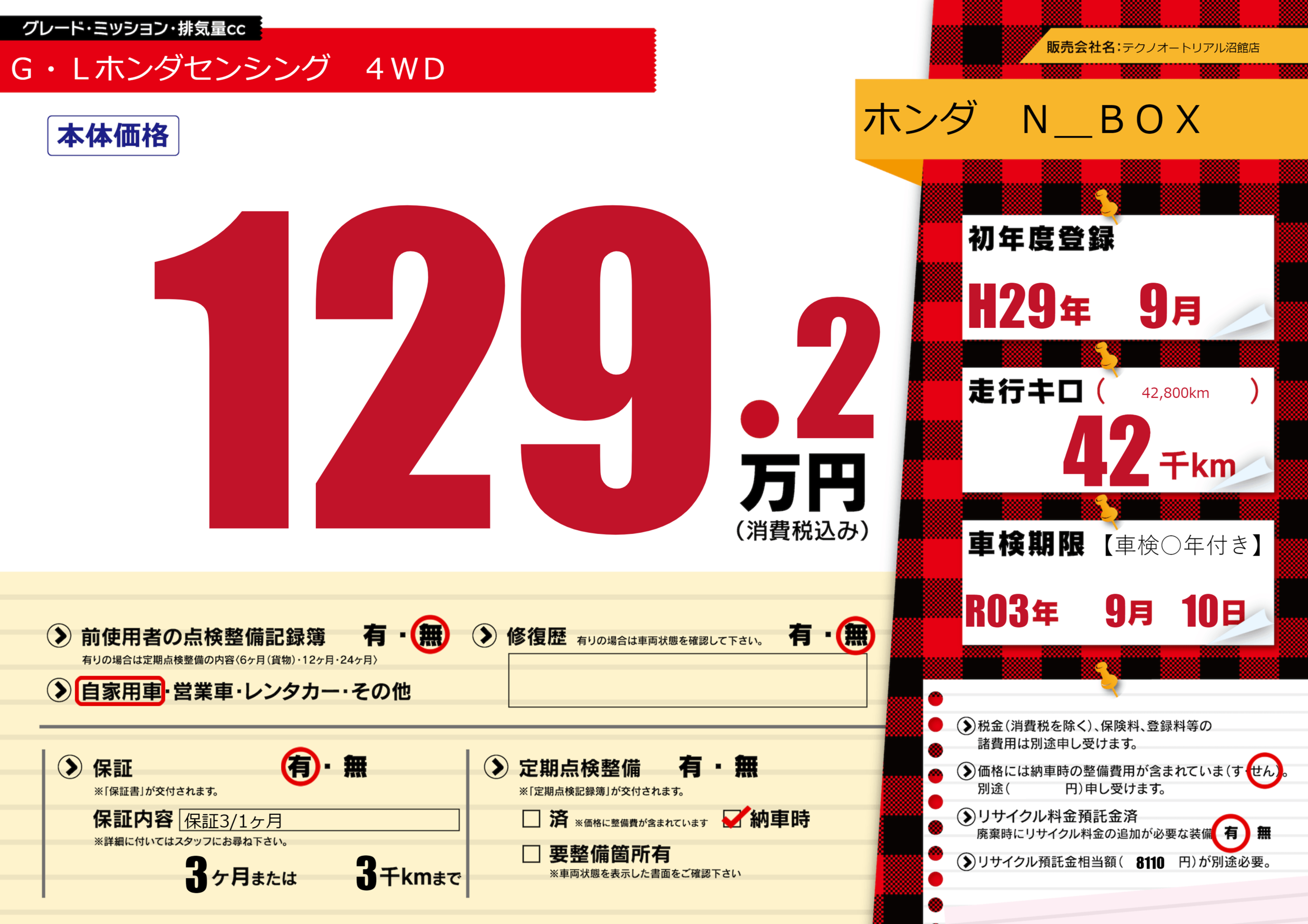 | 車名 | ホンダ N_BOX | グレード ミッション 排気量 |