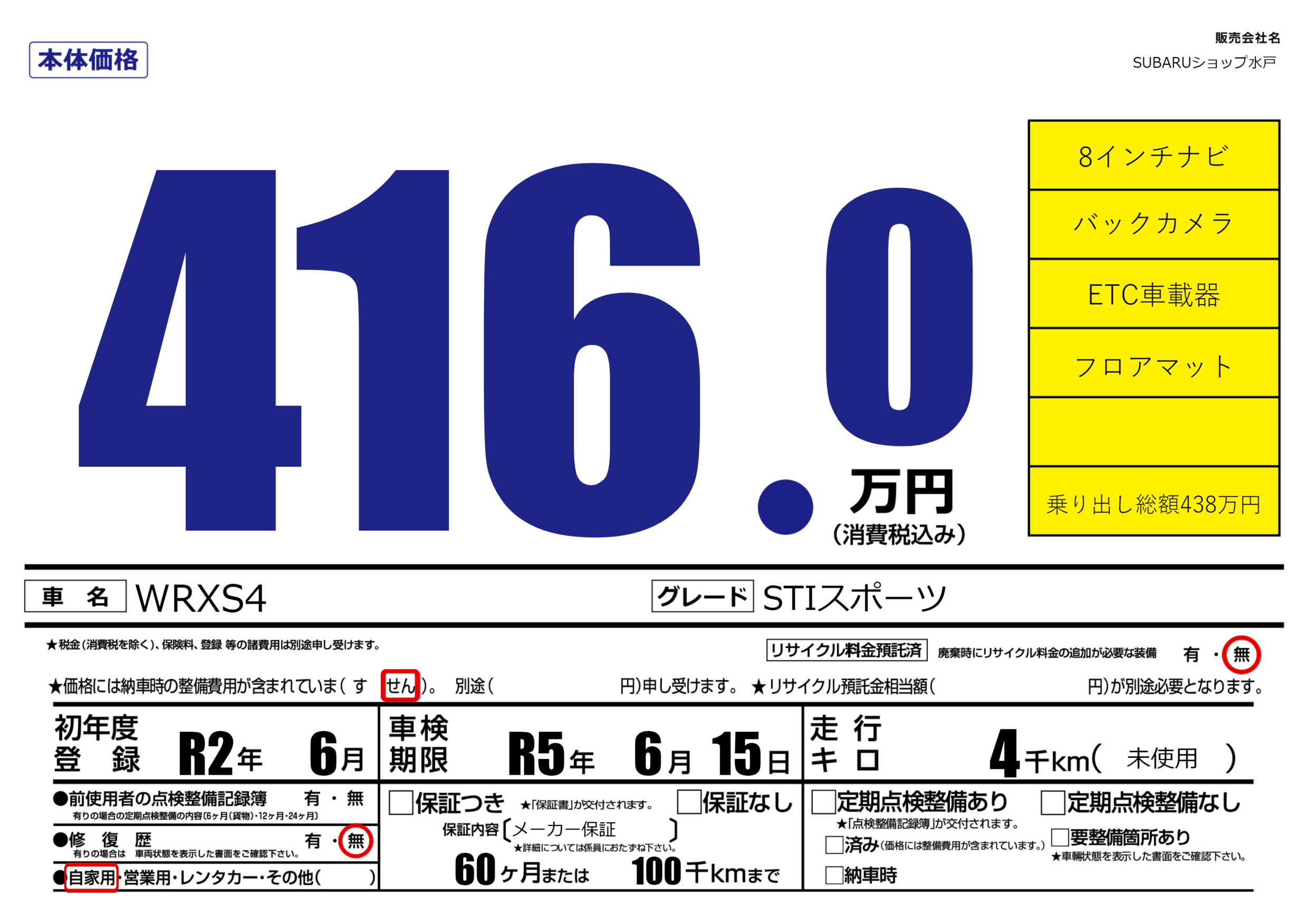 | 車名 | WRXS4 | グレード ミッション 排気量 |