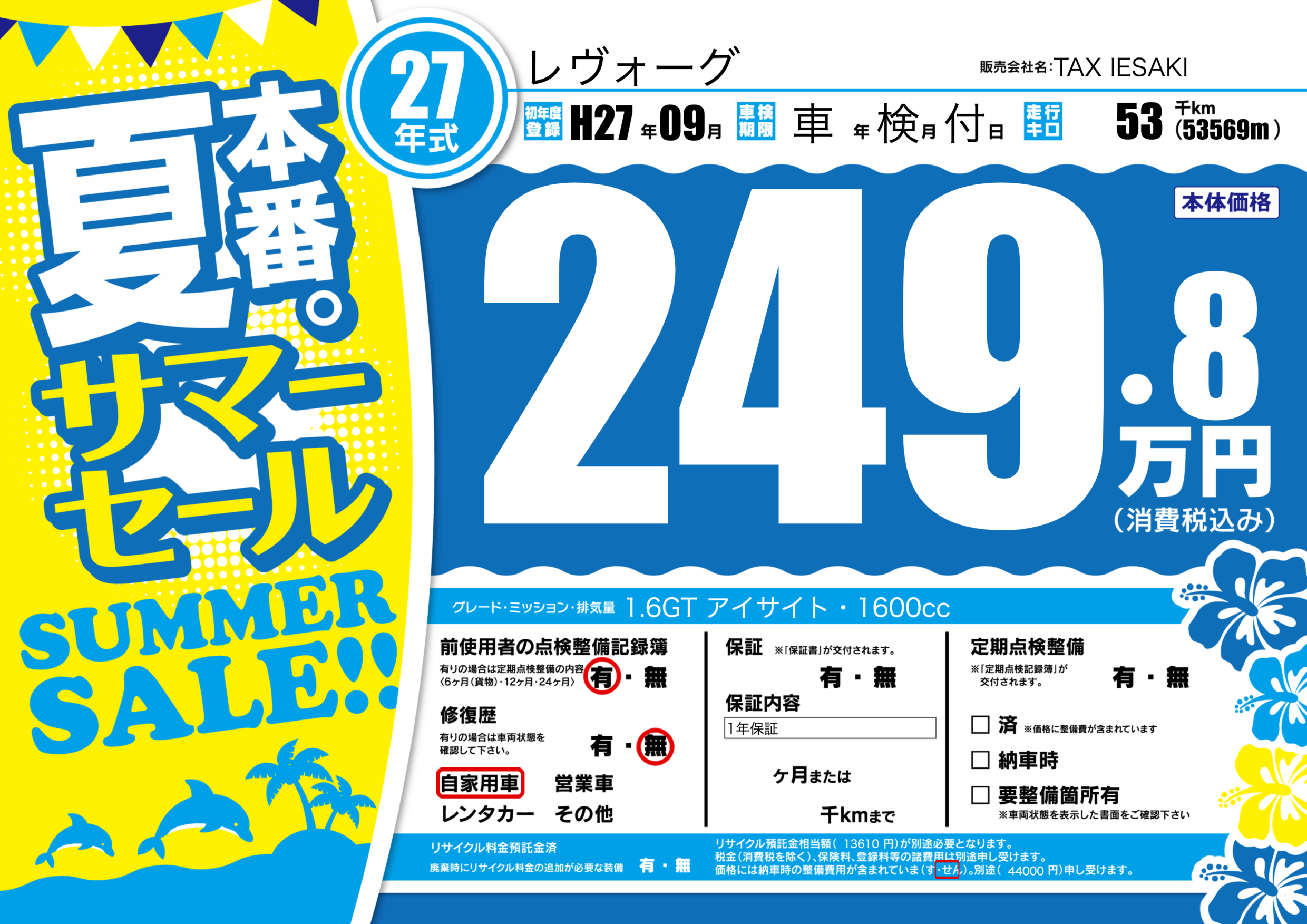 | 走行キロ | 5.3万km | 初年度登録 | H27年09月 |