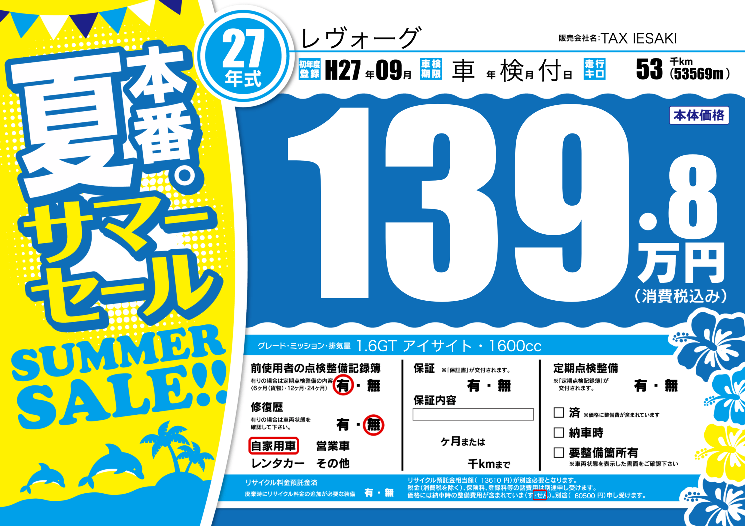 | 走行キロ | 5.3万km | 初年度登録 | H27年09月 |