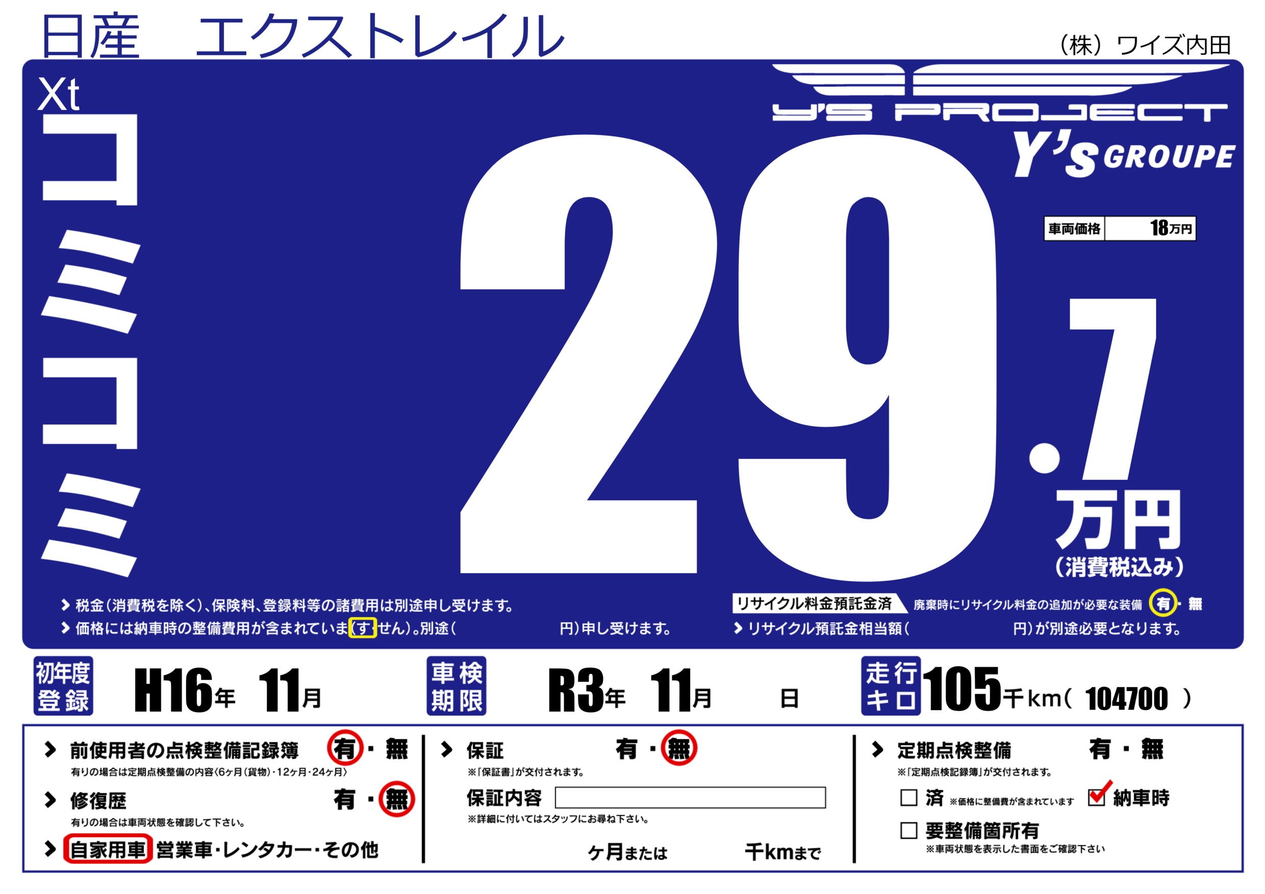 | 走行キロ | 10.5万km | 初年度登録 | H16年11月 |